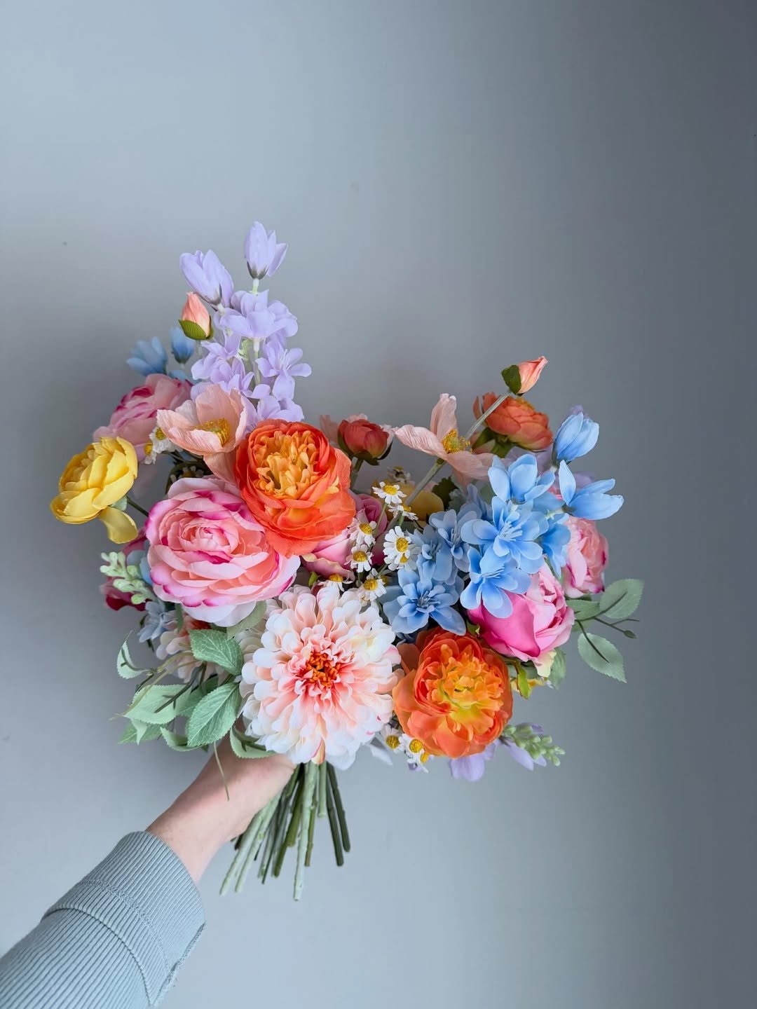 This bouquet is a joyful burst of color, like springtime bottled up. Coral peonies, golden ranunculus, sky-blue delphinium, and buttery roses mingle in a way that feels freshly picked from a painter’s garden. It’s youthful and charming without tipping into overly sweet territory.