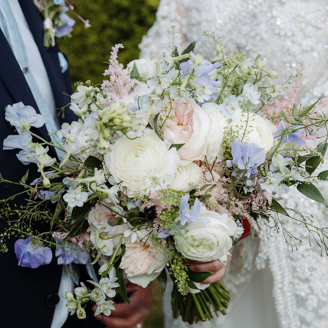 This bouquet feels like a moment out of a storybook. A sea of peonies, delphinium, ranunculus, and garden roses unfurl in peachy-pink and periwinkle hues, like something plucked straight from an English rose garden at golden hour. Held by the bride in a floral-kissed setting, the mix is lush but still light, perfect for a romantic garden ceremony or a bridal editorial with a touch of whimsy.
