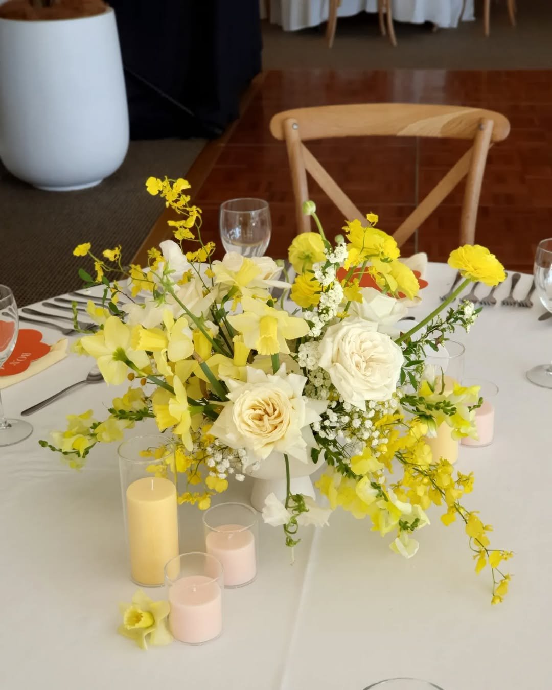 Yellow daffodils, creamy roses, and sprigs of baby’s breath tumble together in the prettiest burst of sunshine. It feels like a countryside brunch where everyone lingers over mimosas and stories. The soft pink and buttercream candles at the base add warmth without stealing focus.