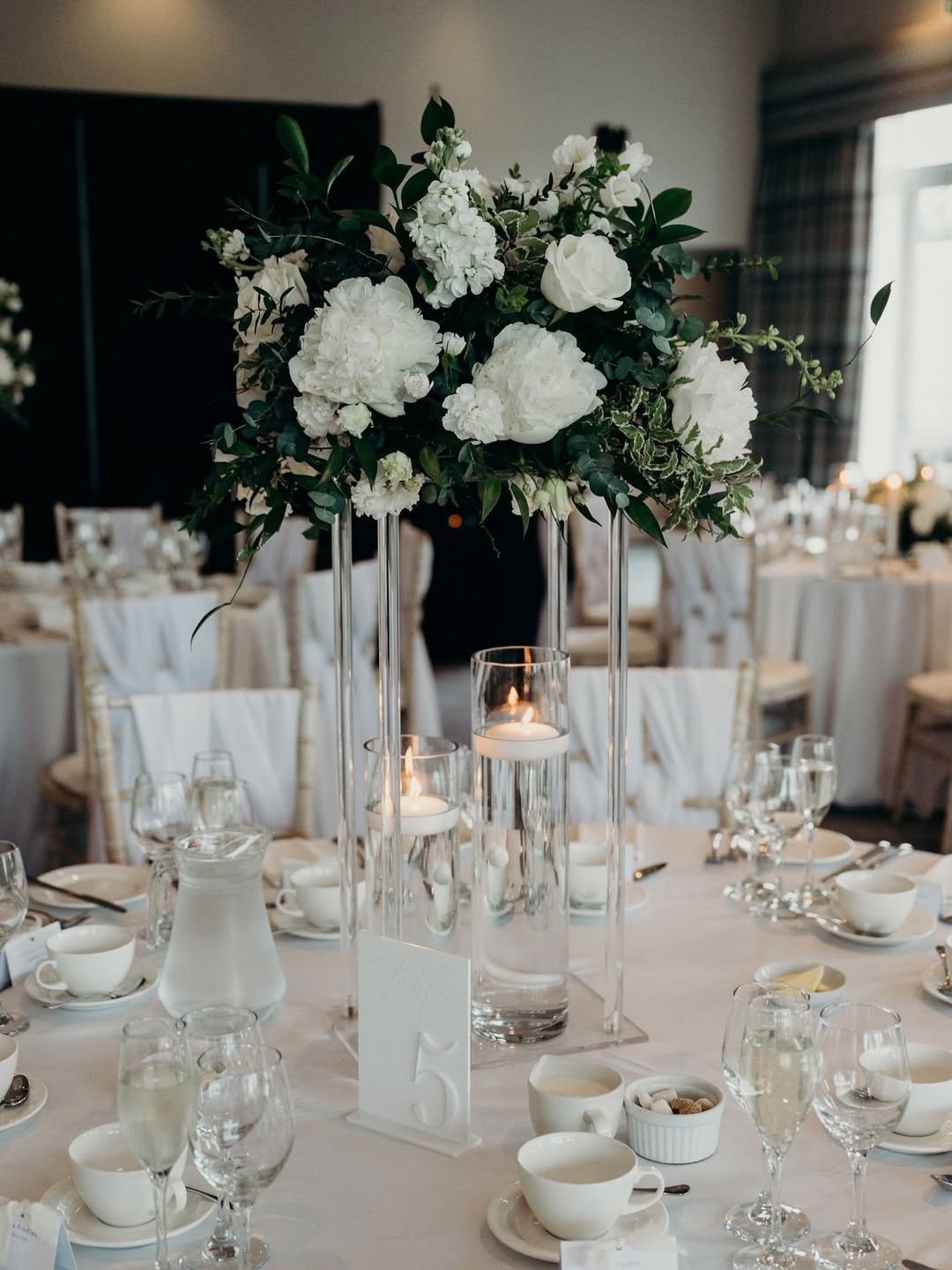 Tall clear stands lift lush white blooms and rich greenery high above the table. Below, floating candles glow inside glass cylinders, adding depth and intimacy.