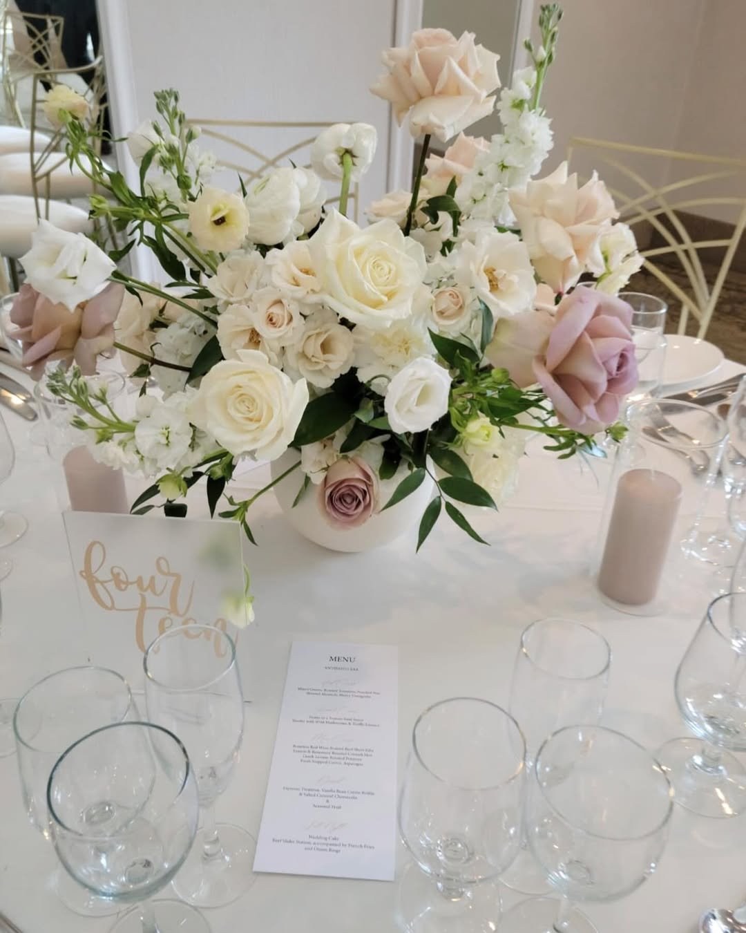 Cream roses, pale blush blooms, and soft greenery create a centerpiece that feels timeless. Nothing flashy, just layers of petal and texture arranged with care.