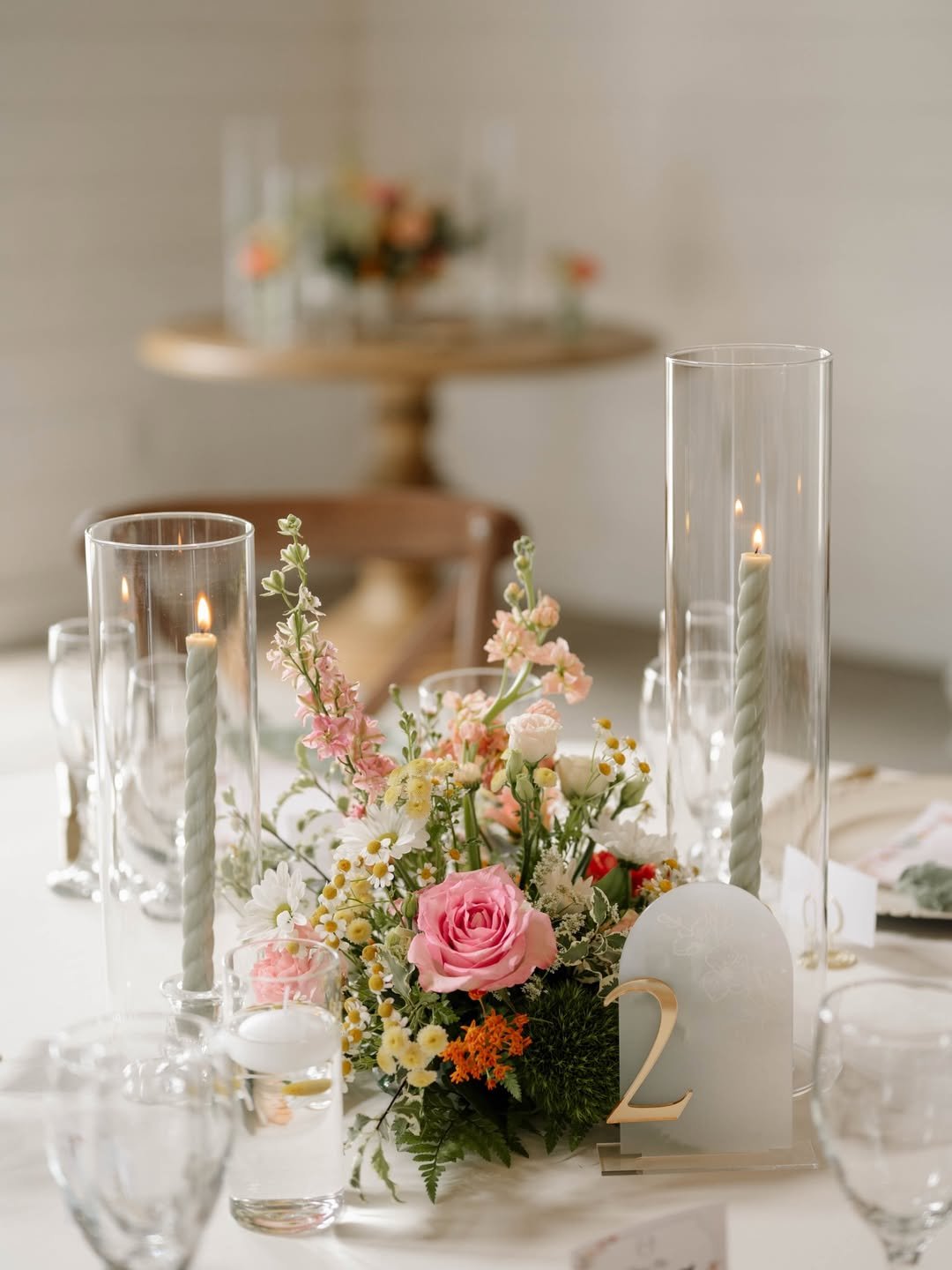 This setting feels personal, almost like a beautifully styled dinner at home. A compact arrangement of pink roses, daisies, and tiny yellow accents sits between tall hurricane candles, creating a layered but intimate look. The soft green tapers add a subtle earthy note.