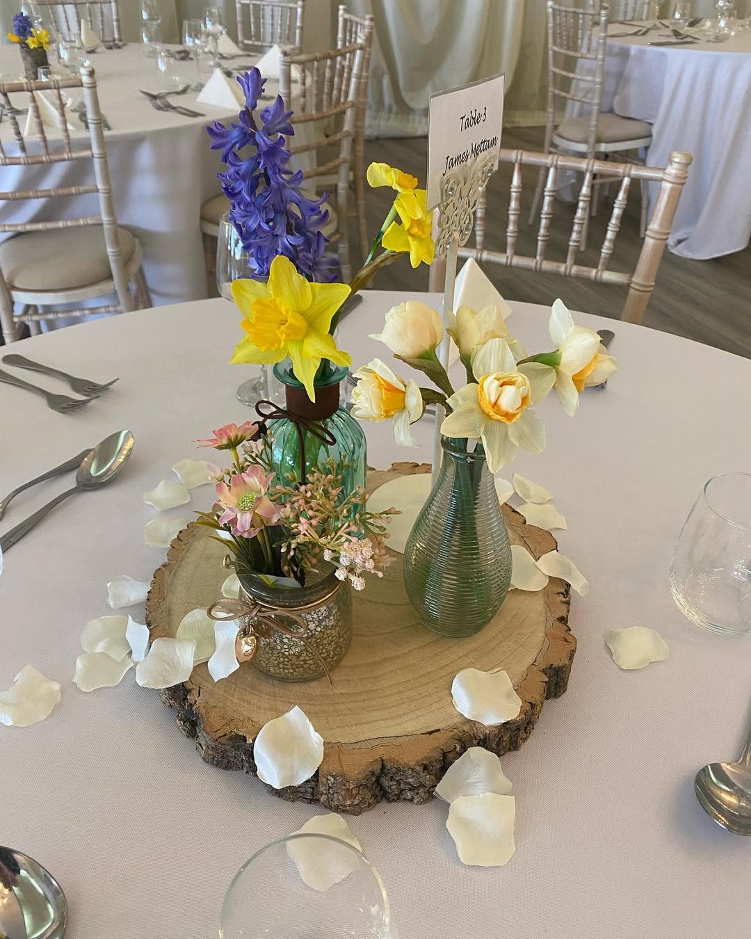 A wooden slice anchors a trio of petite glass vases, each holding its own little moment. Daffodils, hyacinths, and blush florals create a playful mix of color, while scattered petals soften the table.