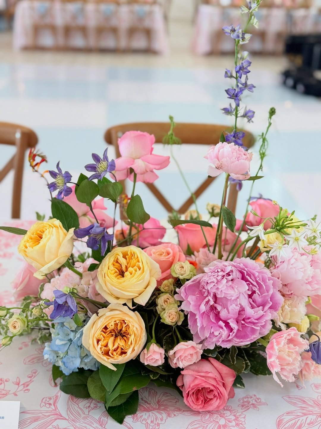 This arrangement is pure abundance. Golden garden roses, pink peonies, soft blue hydrangea, and climbing clematis create a layered composition that feels almost painterly. The pink patterned linen underneath adds depth without competing.
