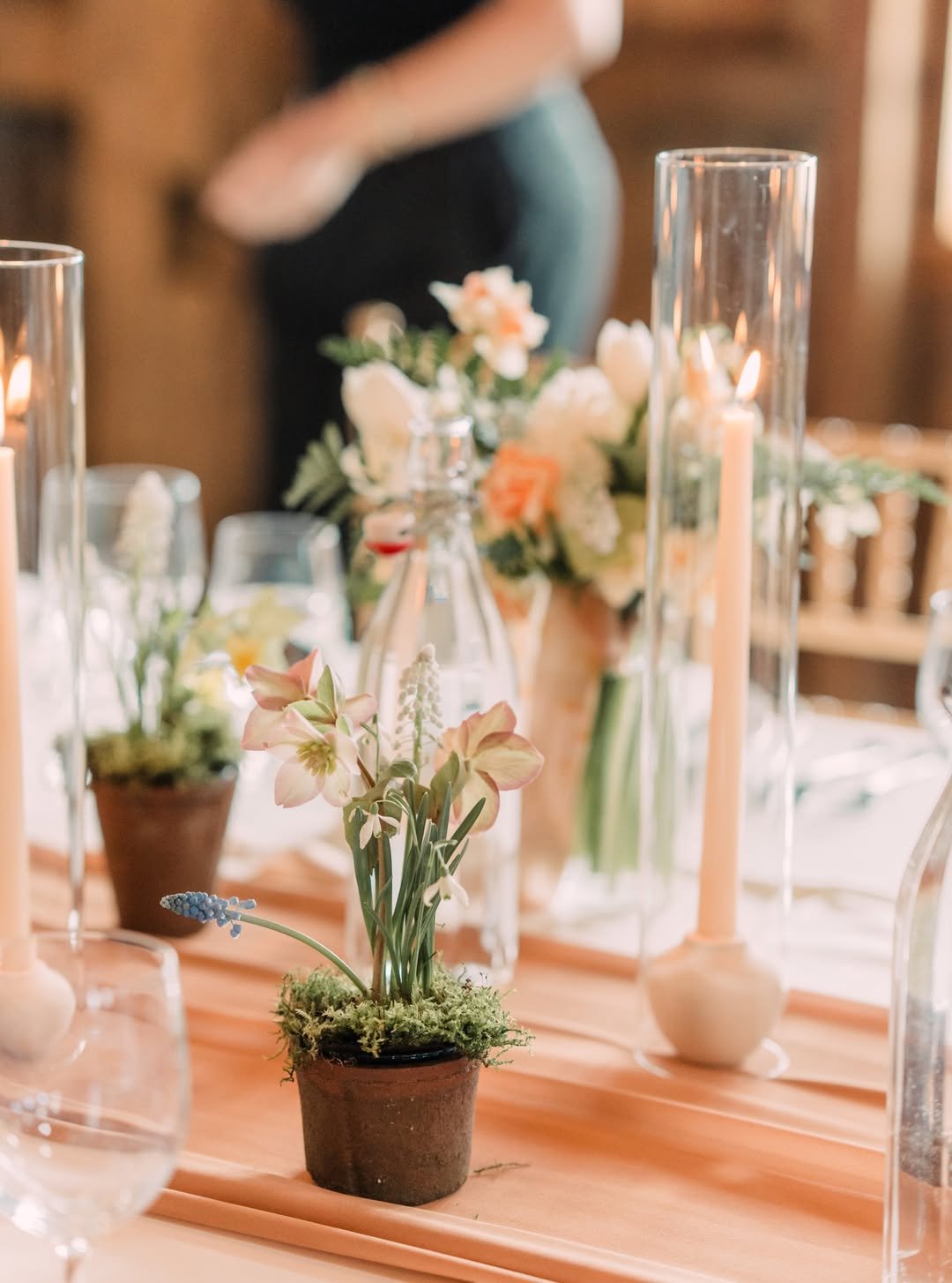 Tiny potted blooms placed along a wooden runner bring such a sweet, organic touch. Moss-lined pots and delicate spring flowers feel charming and personal.