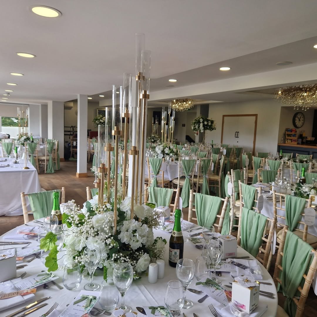 If you love a statement centerpiece, this one delivers. Sleek gold stands stretch upward with glass sleeves and glowing tapers, while a cloud of white florals and greenery anchors the base. The sage chair sashes echo the greenery and tie the whole room together.