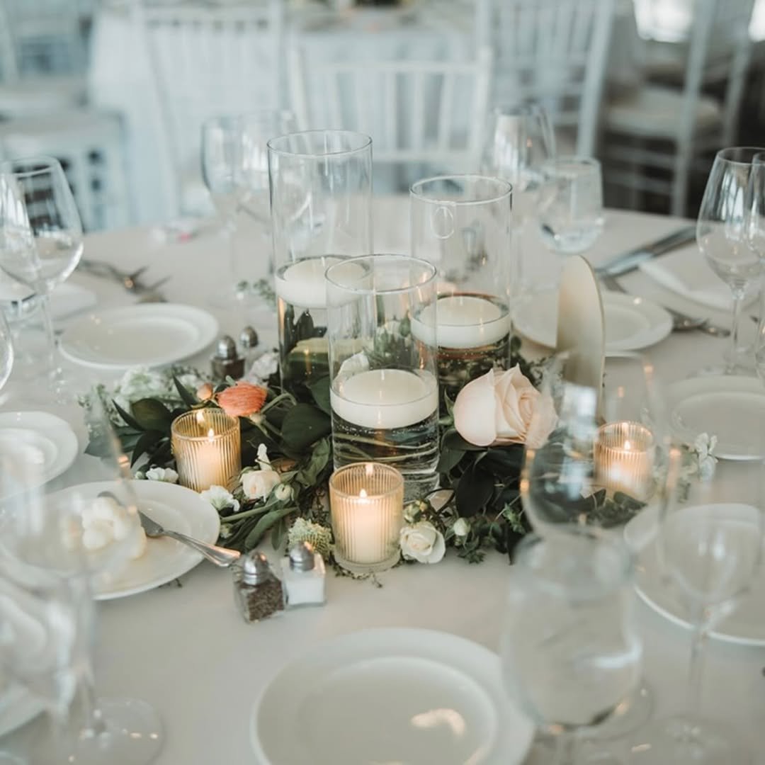 Floating candles in tall cylinders bring instant calm to this setting. Nestled among greenery and pale roses, they create a soft glow that feels intimate and timeless. The white-on-white tableware keeps everything refined, letting the florals and candlelight do the talking.