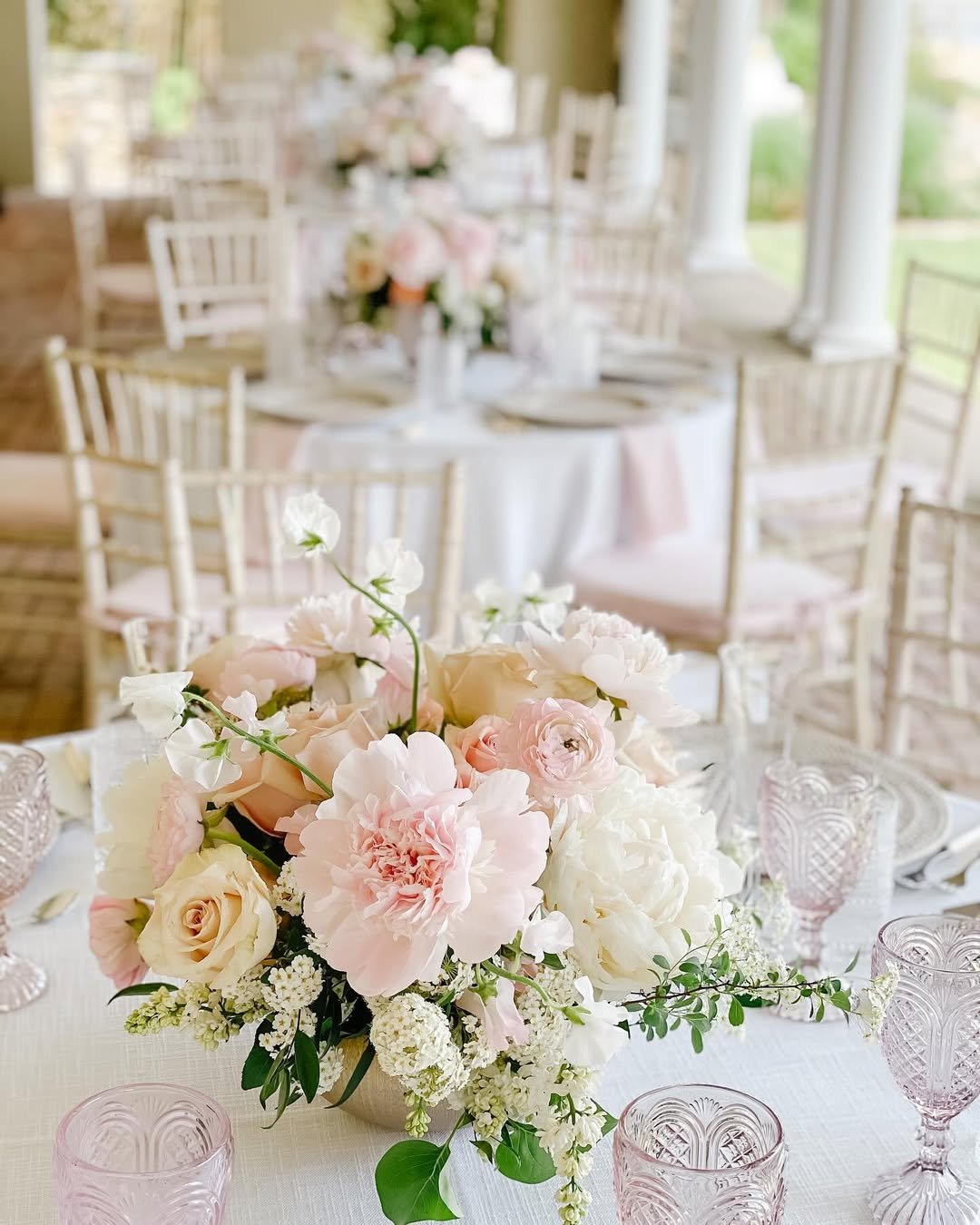 Soft blush peonies and creamy roses rest in a rounded vessel, surrounded by pale pink goblets that catch the light just enough. The veranda setting with white columns and gold chairs adds a subtle grandeur that elevates the entire look.