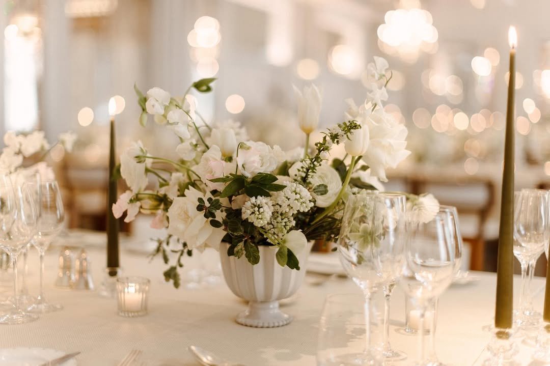 This one whispers instead of shouts. A low ivory arrangement nestled in a classic urn, surrounded by olive-toned tapers and warm candlelight, sets a mood that feels intimate and cinematic. The florals lean into texture, layered petals, delicate greens, and soft movement.