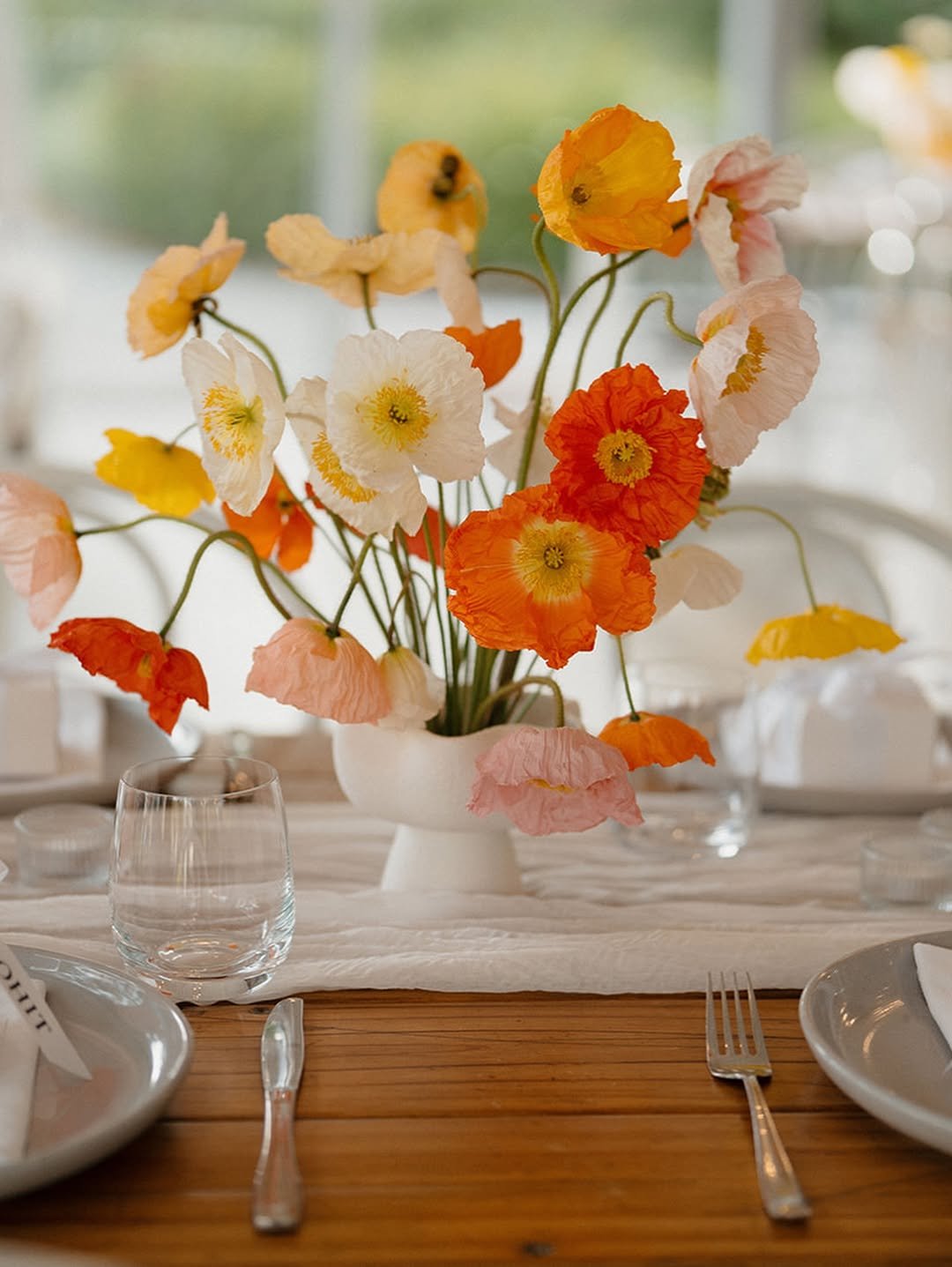 Now this is how you bring joy to the table. Coral, tangerine, buttercream, and blush poppies dancing on thin stems feel carefree and fresh. The white pedestal vase keeps it grounded, giving structure to what could otherwise feel wild.