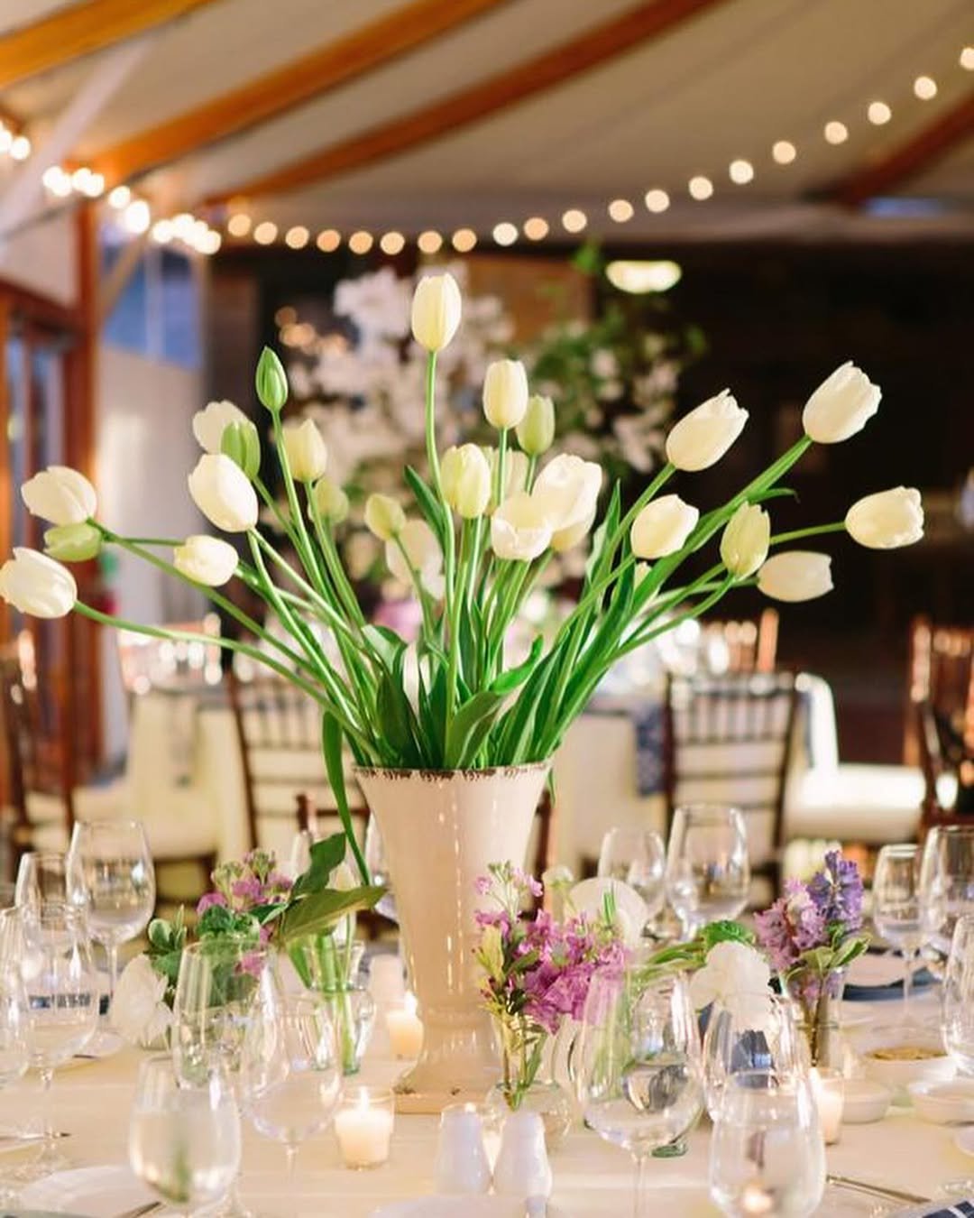 There is something about white tulips standing tall in a classic pedestal vase that feels instantly refined. The height draws your eye upward, adding drama without cluttering the table.
