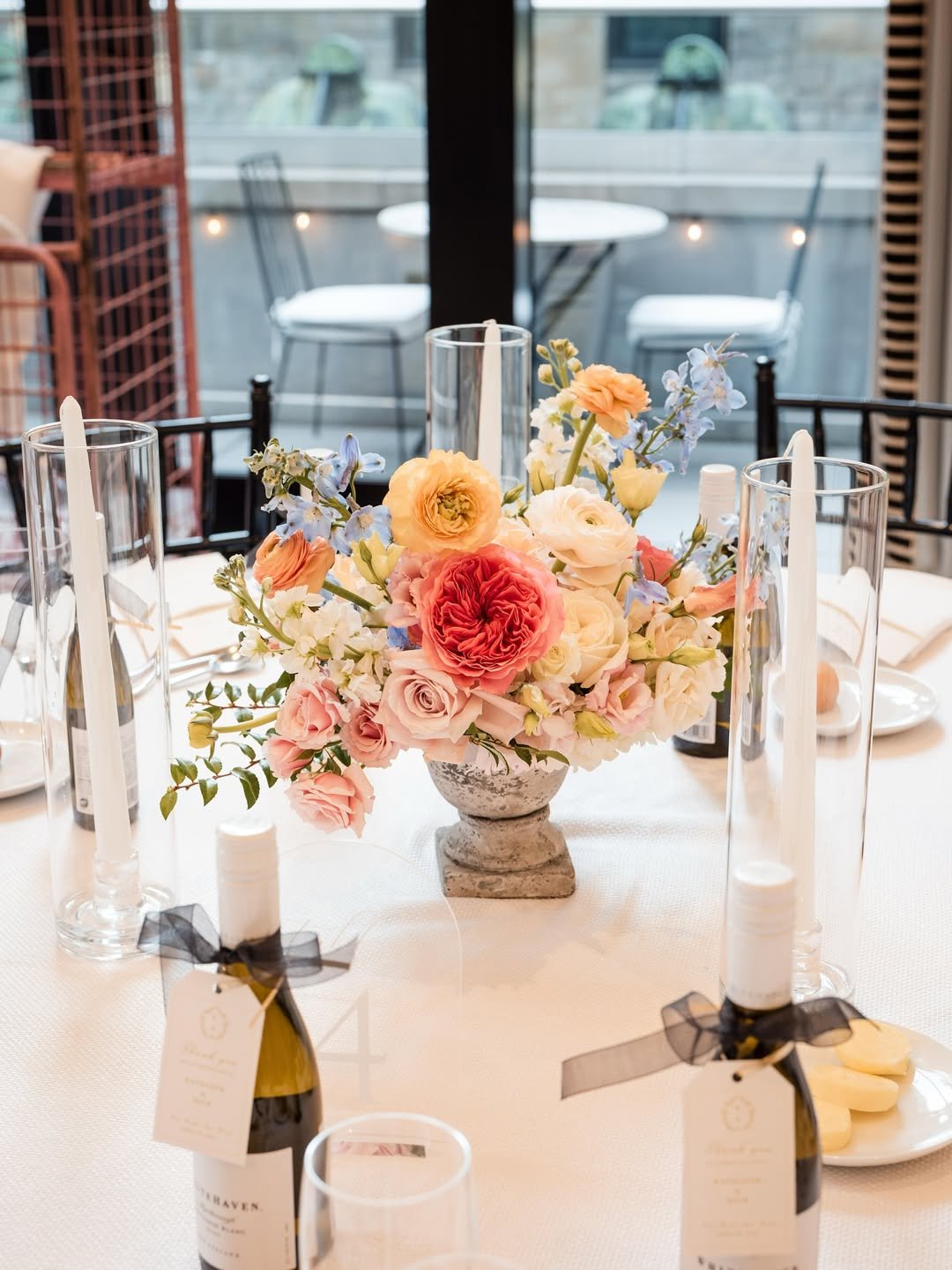A stone compote filled with peach ranunculus, blush roses, and one showstopping coral bloom sets the tone here. The palette leans into warm rosé and cream, balanced by soft blue accents that keep it from feeling sugary. Tall glass hurricanes frame the arrangement, adding height without stealing attention.
