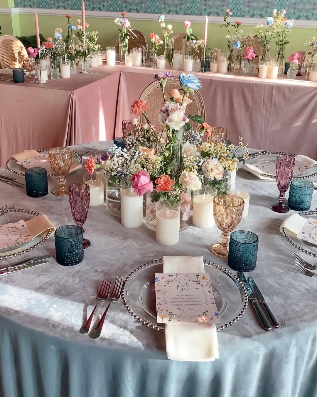 This round table is pure storybook energy. Pink linens set a romantic base, while mixed bud vases and pillar candles create a layered, collected feel. Colored glassware in amber and teal adds personality without overwhelming the palette.