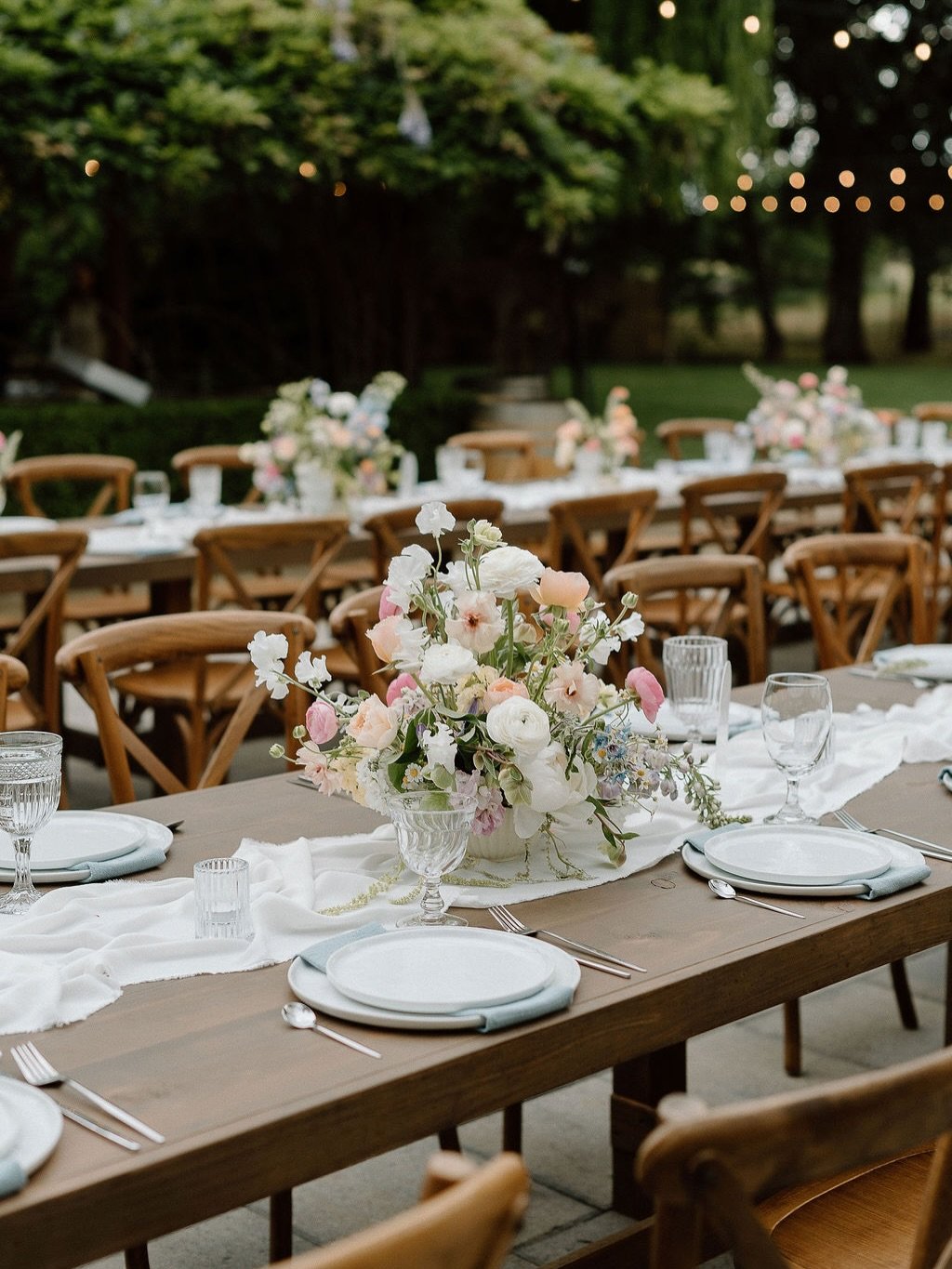 Long wooden tables under string lights will always win me over. Here, pastel arrangements sit low and lush along a gauzy runner, allowing the natural wood grain to peek through. The palette stays whisper-soft with ivory, blush, and the faintest touch of blue.