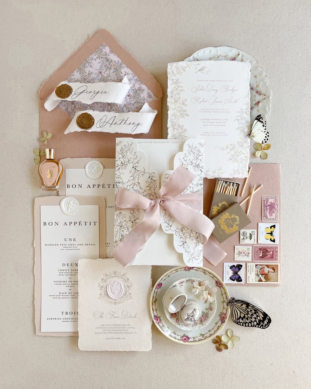 Like a vanity tray filled with heirlooms, this suite layers soft pinks, vintage stamps, scalloped paper, and dainty ribbons. There’s a playful romance to the butterfly motif and cameo seal — a nod to nostalgia without feeling kitsch.