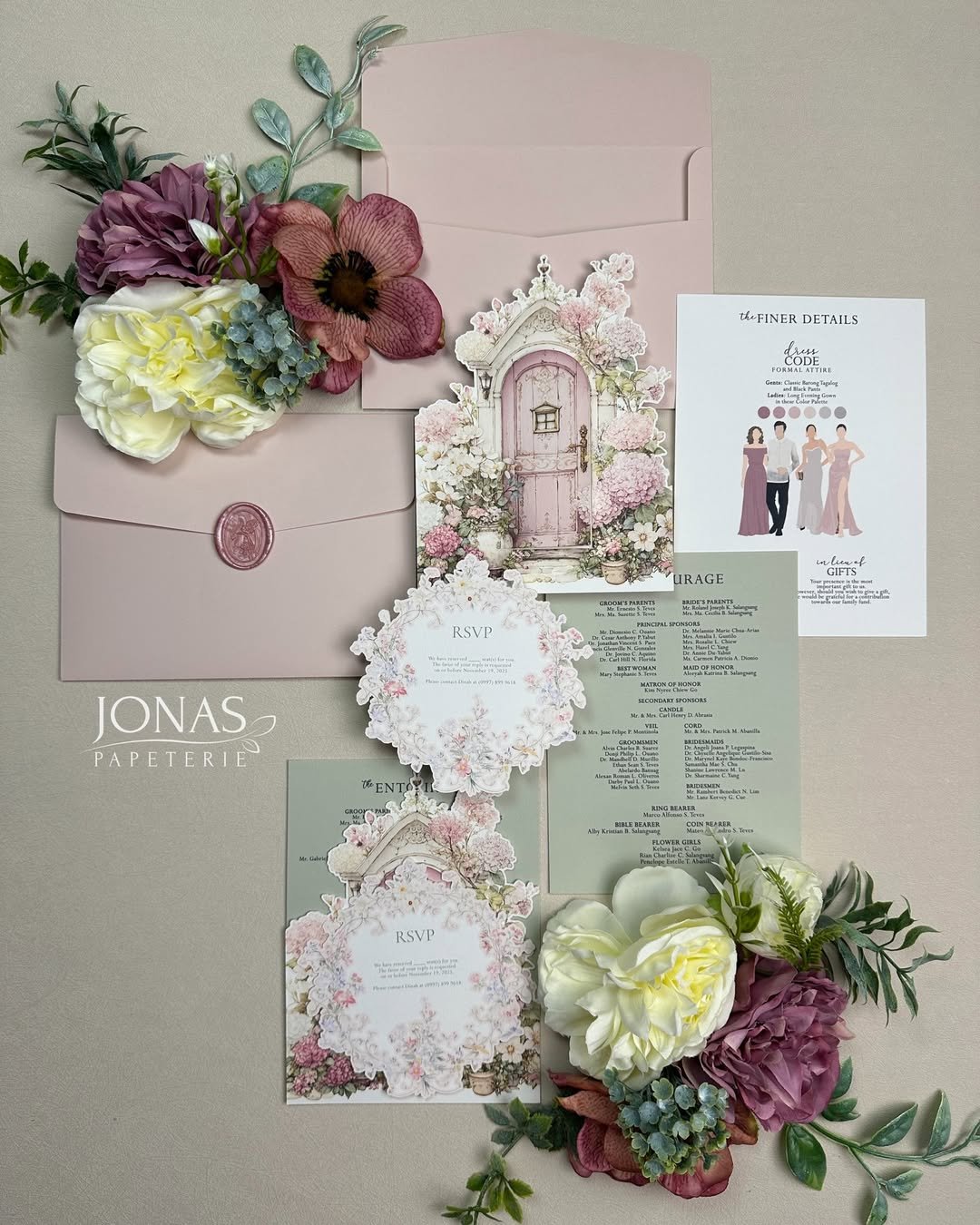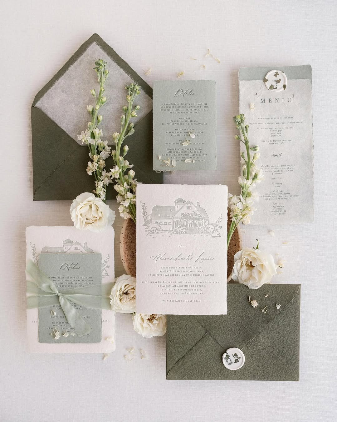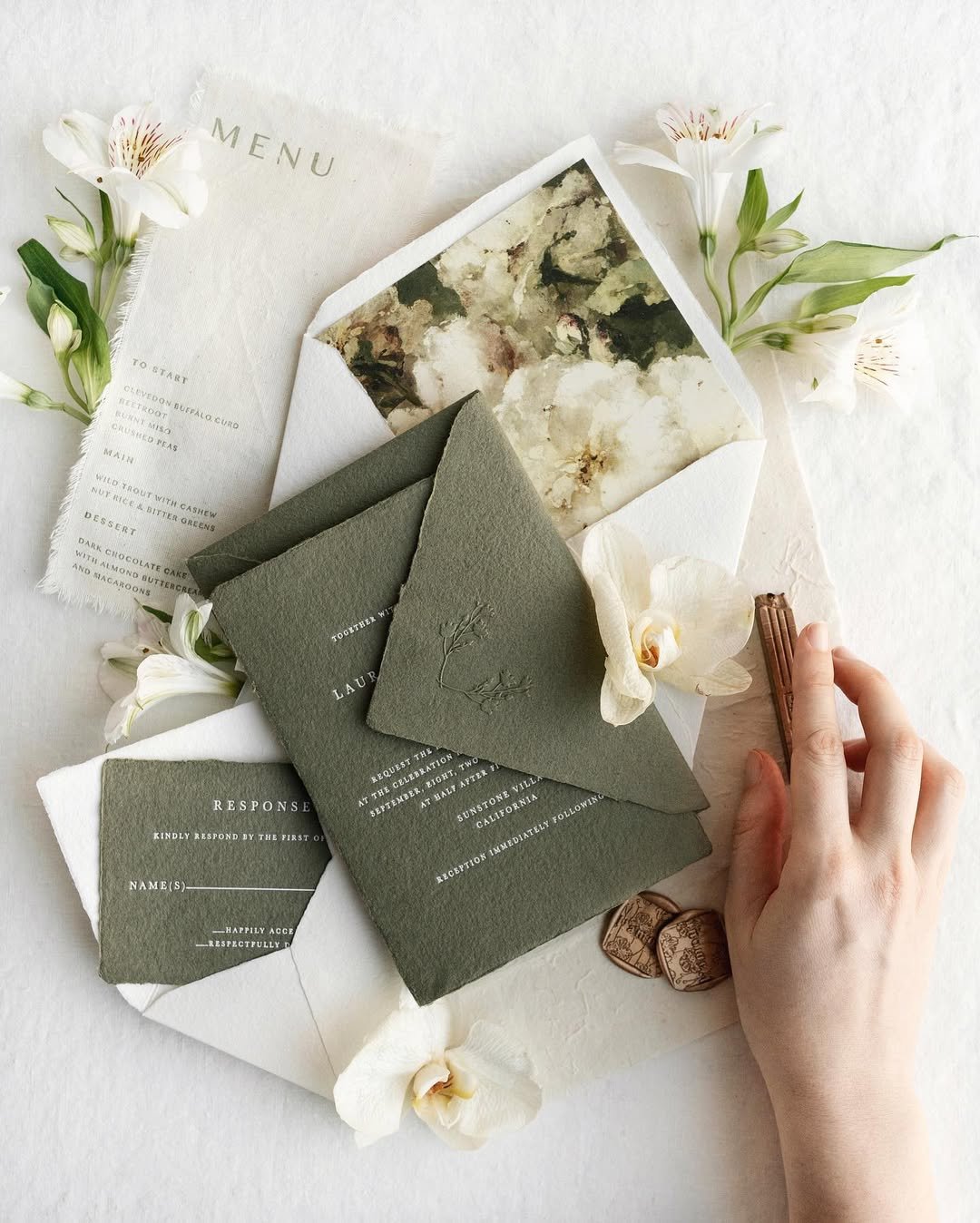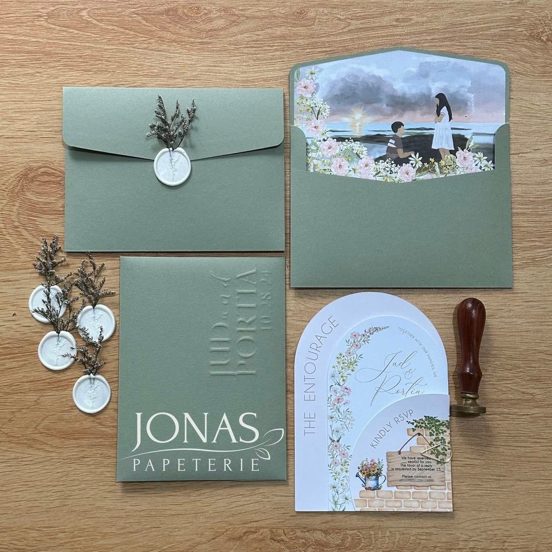 For those who favor a wilder kind of beauty, this olive-toned suite is effortlessly poetic. The deep green envelopes with blind embossing create a rich base, while ivory blooms and painterly liners soften the palette.