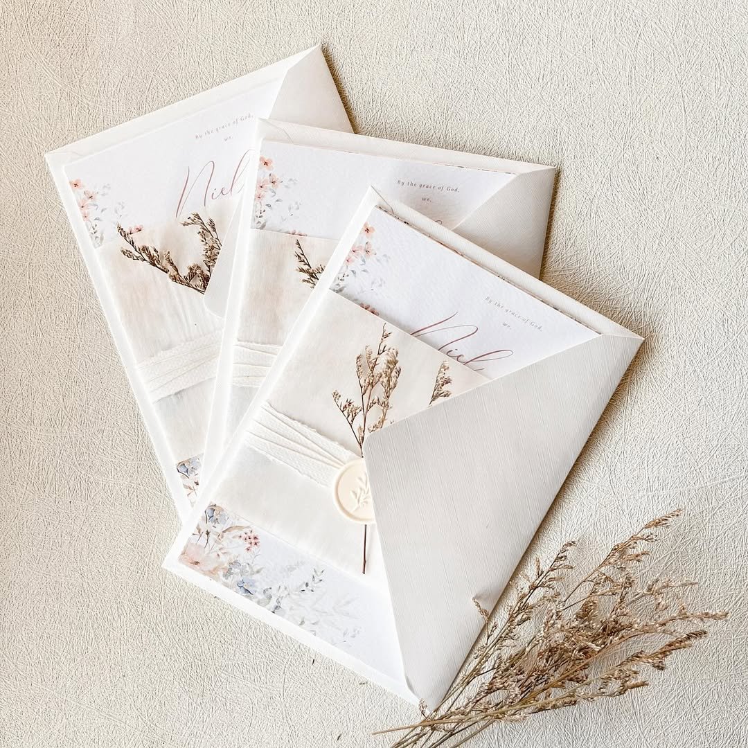 From the wax seal to the dried petals tucked within, it’s built for a couple who values detail without drama.