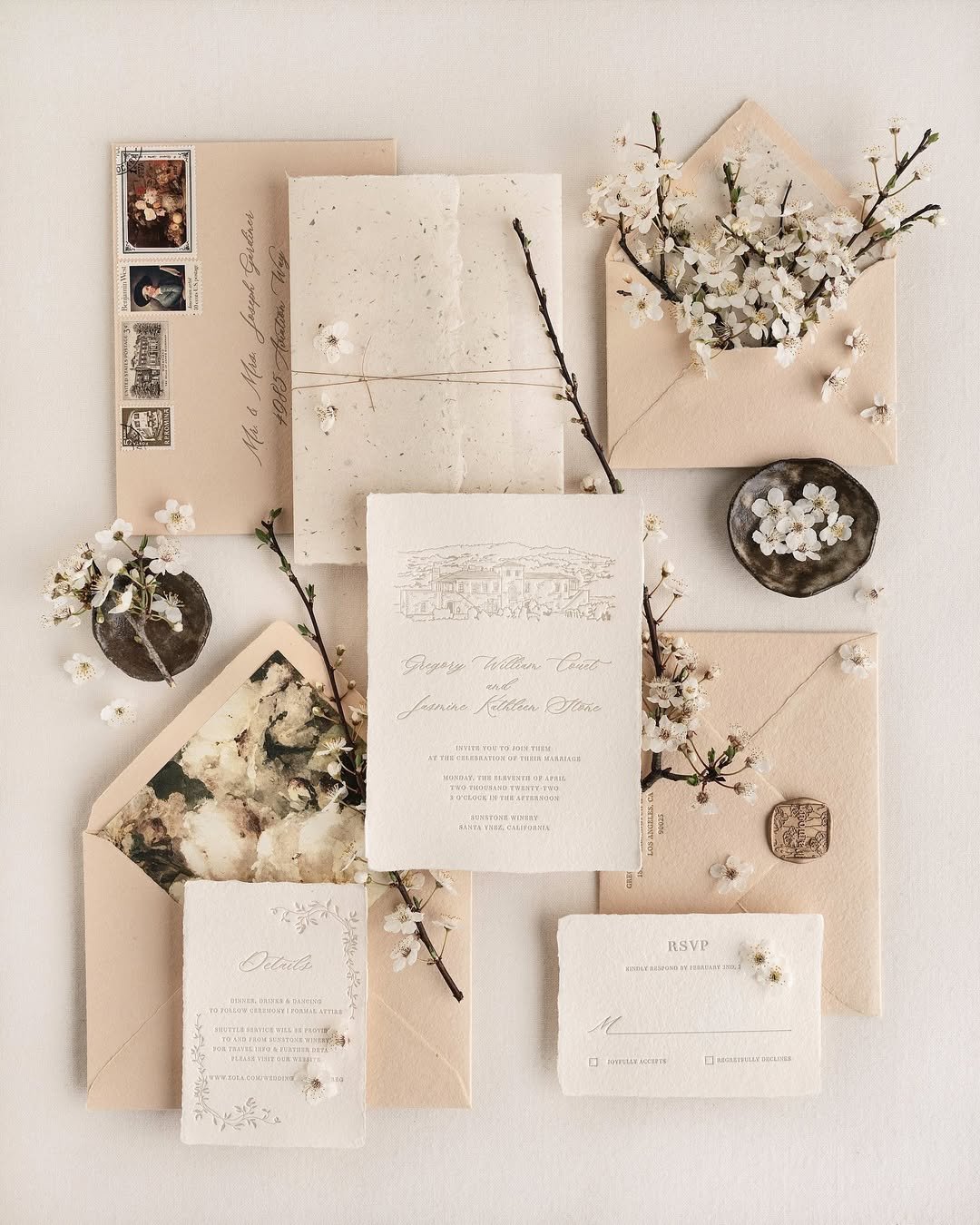 The handmade paper and ink-drawn venue sketch offer a gentle nod to heritage, while the cherry blossom sprigs scattered through the layout whisper, “spring is here.” Understated luxury at its most grounded.