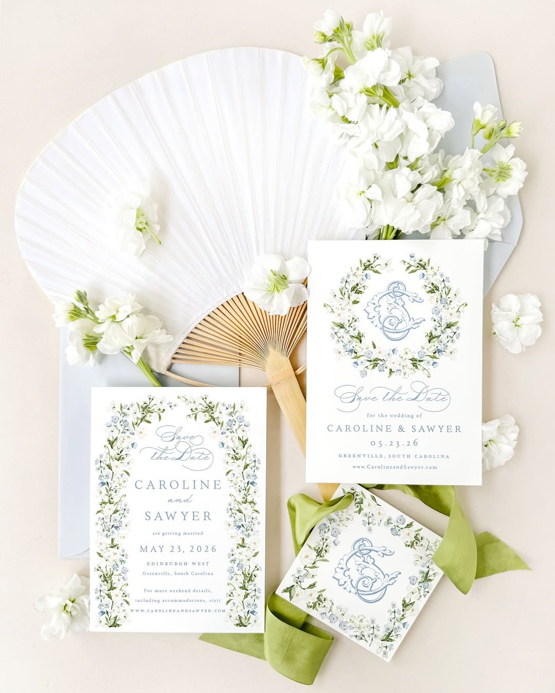 With crisp white flowers, soft blue script, and a wreath motif that feels straight out of a storybook, @empressstationery brings a touch of southern charm to spring weddings. The invitation feels light and joyful, while the pale green ribbon gives it an organic, grounded finish.