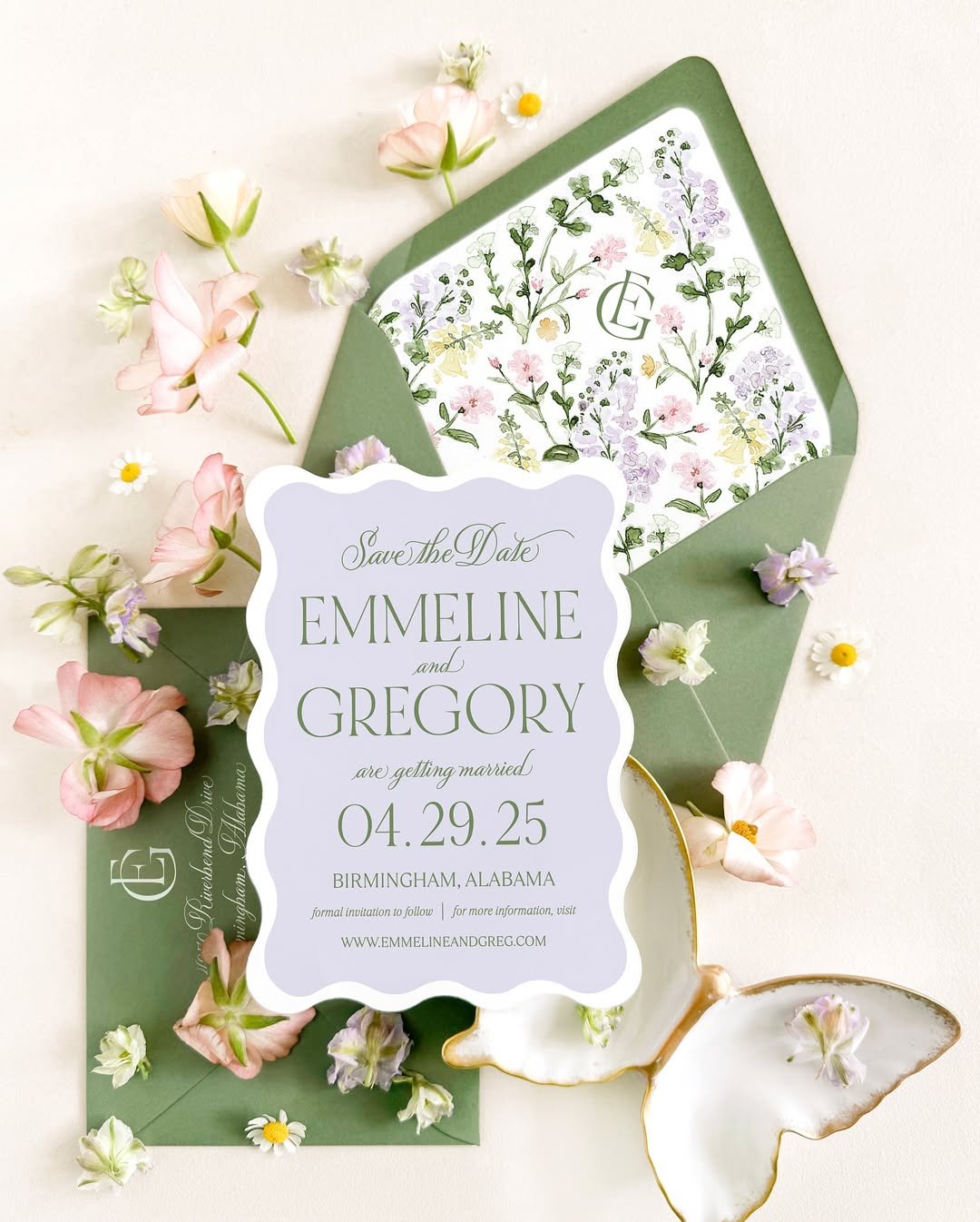Green envelopes, wildflower-lined liners, and a lilac wave-edged card—@empressstationery knows how to make a spring suite feel both playful and polished. This one brings color and joy in a way that’s still totally refined.