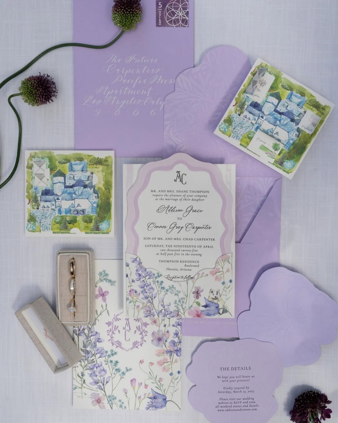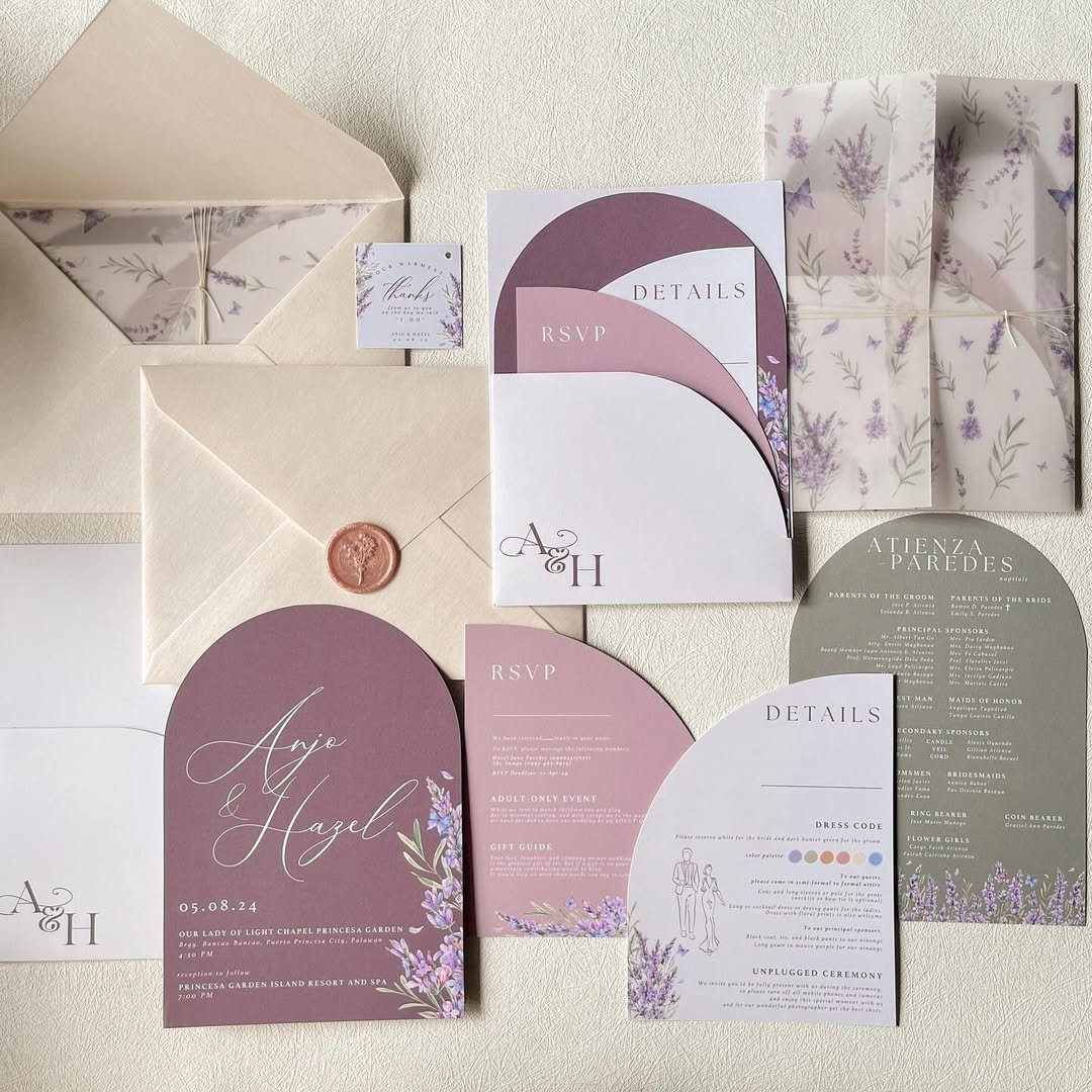 The lavender-hued layers in this set are giving soft drama in the most elevated way. From scalloped curves to folded vellum and wax-sealed envelopes, @an.designsstudio blends modern shapes with timeless romanticism. It’s playful without being precious—just right for a couple who wants their spring wedding to feel like a blooming poem.