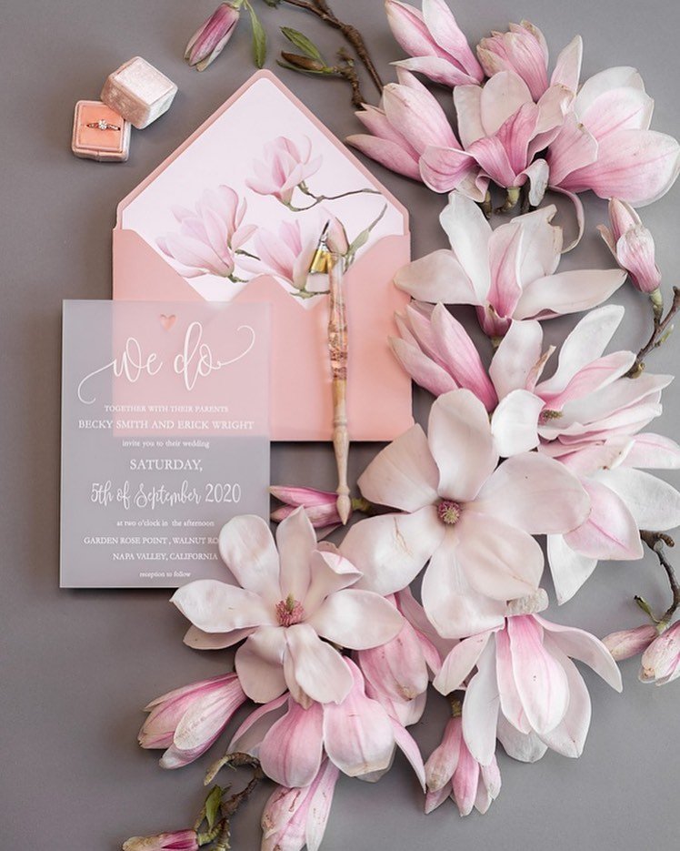 Everything about this design feels intentional—from the sweeping script on the translucent overlay to the blush magnolia blossoms spilling out in every direction. The pairing of the acrylic-style invite with layered petals gives it that ethereal, editorial finish. And the pink-on-pink envelope liner? A soft but striking detail.