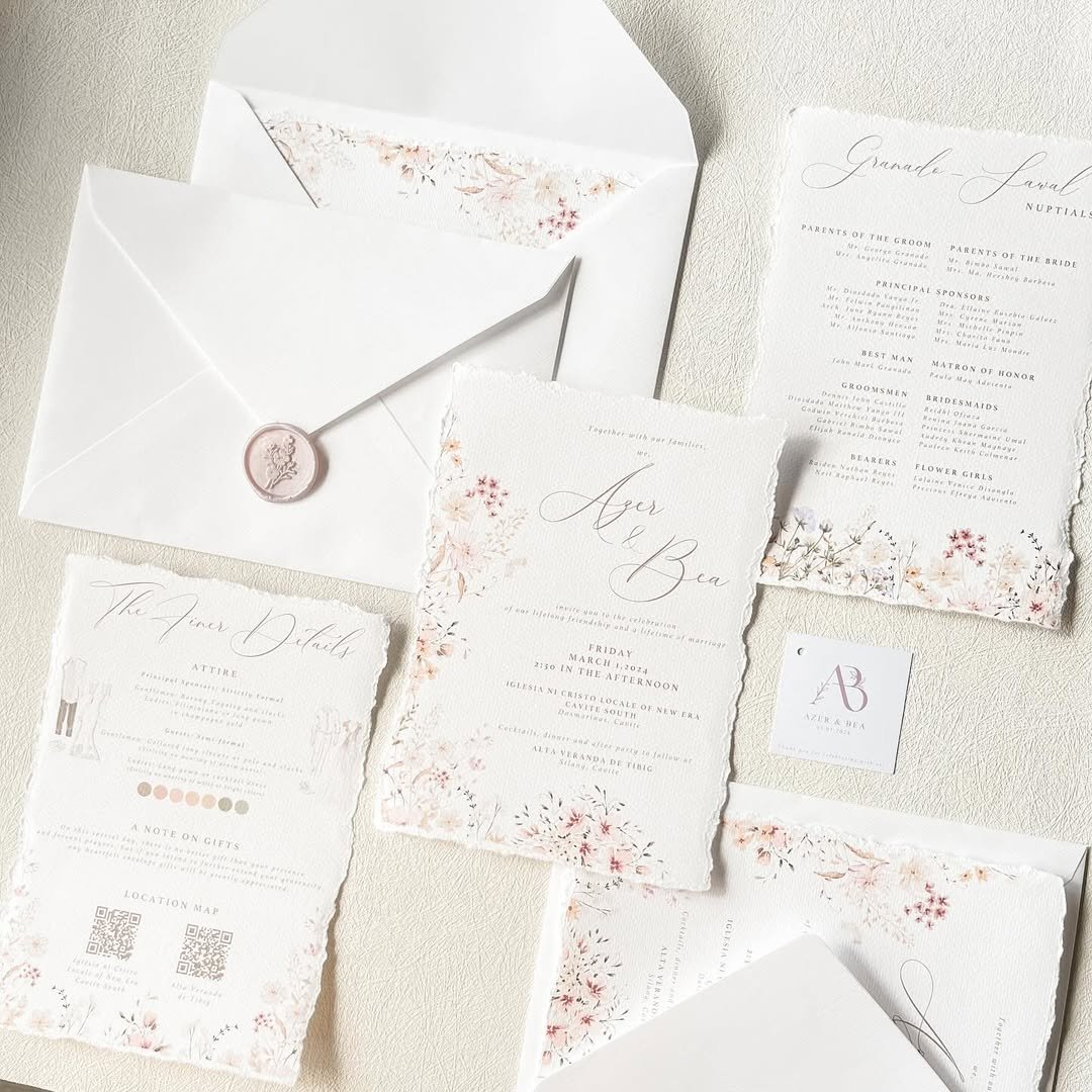 If spring weddings had a scent, this suite might be it—think crisp morning air, dried lavender stems, and creamy envelopes with a vintage soul. @an.designsstudio pairs blush-toned botanicals with textured paper and minimalist type, all tied together with twine and a wax seal that feels antique and intimate. It’s the kind of invitation you want to run your fingers over.