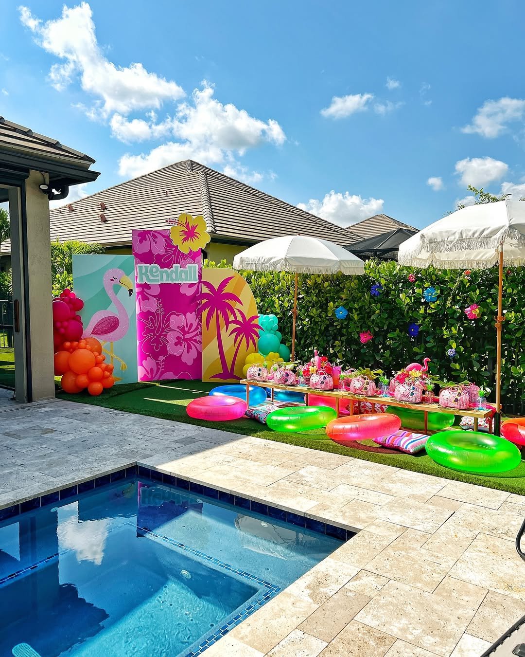 Everything about @bombas_events’ setup screams “vacay in a backyard.” From the bold flamingo cutouts to the punchy Barbie-pink panels, this party is all color, all sunshine, all sass. The mini picnic table, complete with tropical snacks and neon floaties as seats, makes it feel interactive and intimate.
