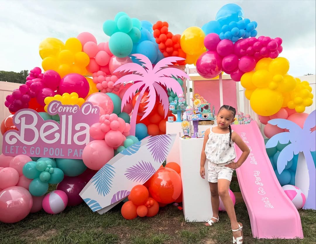 There’s no missing this party. @betsidecoandsweet turned the volume all the way up with a rainbow balloon explosion, tropical cut-outs, and a bold “Come On Bella” sign that makes this whole scene scream “main character moment.” Add in the bubblegum-pink slide and palm tree props, and it’s a full-on Barbie adventure.