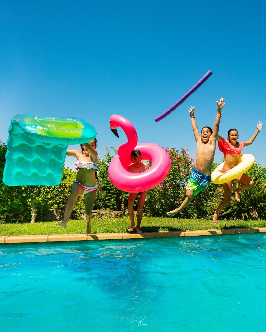 Simple. Joyful. Unfiltered. @trasolinipools captures the essence of summer: kids mid-air, floaties in tow, and a sky so blue it practically hums. There’s no styling here—just raw, splashy fun. And sometimes, that’s exactly what a pool party needs.