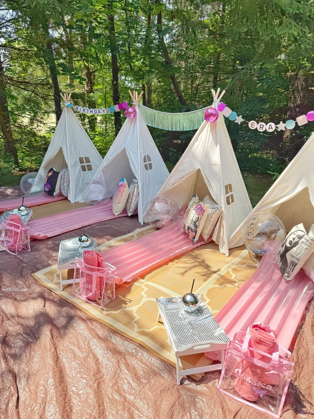 @hvqueensofteepees proves that glamping can totally go poolside with these luxe teepees set in a forest clearing. Everything here whispers glam—from the blush floaties as daybeds to the monogrammed clear totes and glittery disco sippers on each table.
