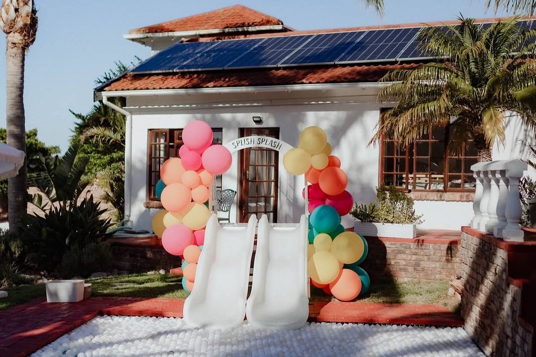 @bubblehouse_portelizabeth’s setup feels like a mini resort just for kids. Twin slides lead into a sea of white ball pit bliss, framed by a playful balloon rainbow on either side. The “Splish Splash” sign above the door adds a cheeky nod to the fun, and we love how the whole thing balances clean minimalism with color play.