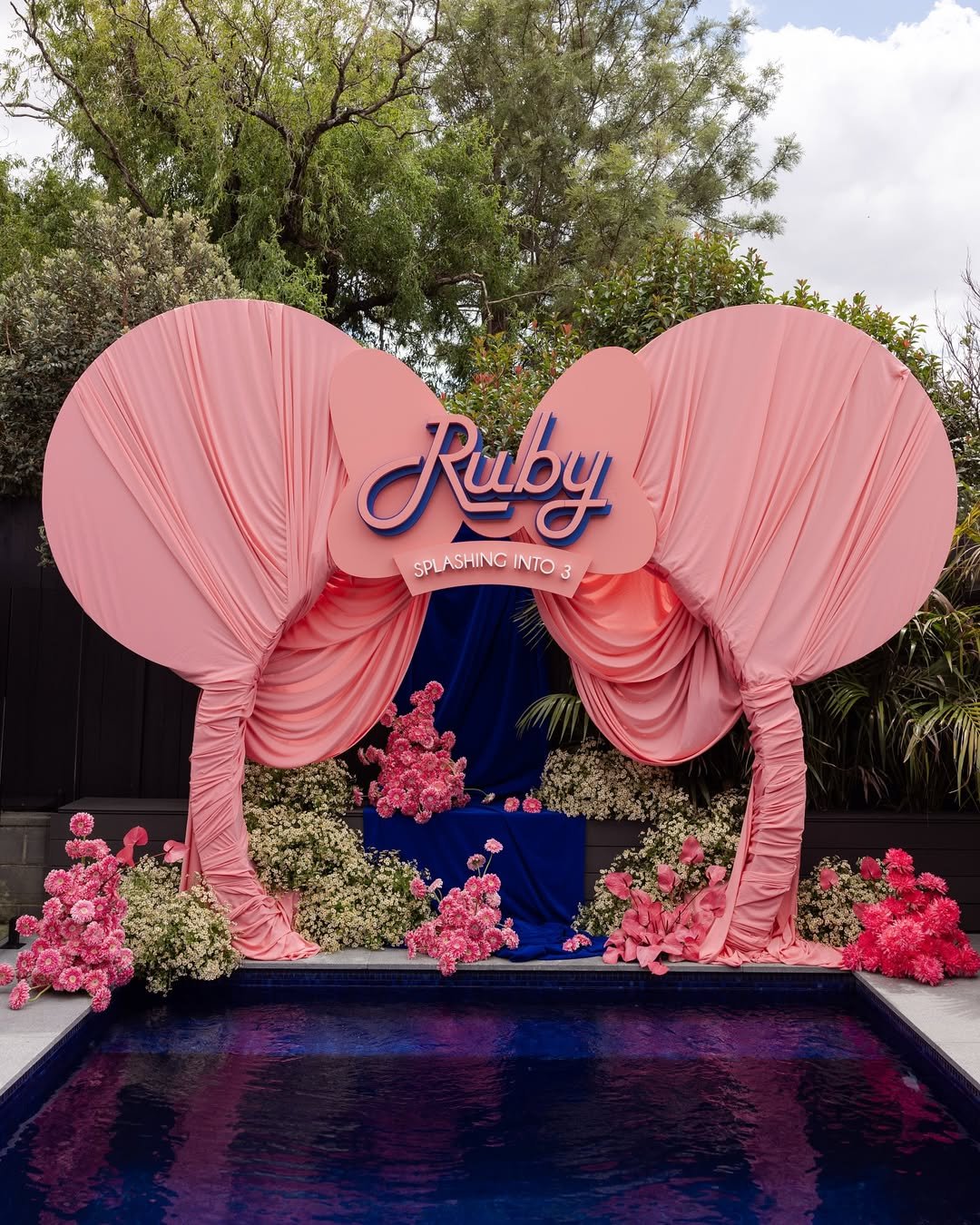 This one’s got drama, darling. @miladyland’s designer-themed pool party leans hard into luxe, with a Louis Vuitton x Vogue-inspired backdrop and saturated balloon clusters in primary hues. It feels high fashion but still fun, like a couture birthday for your inner creative director.