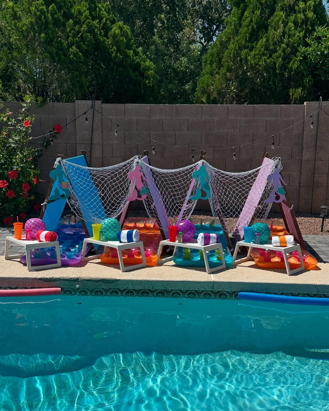 @azsleepyteepee brought serious under-the-sea vibes with this mini mermaid setup by the pool. Think pastel tepees strung with nets, cut-out sirens in soft hues, and inflatable loungers that look straight out of a beachside cabana daydream. Each little “pod” has its own mini tray, striped towel, and color-coordinated drink cup—adorably intentional, without feeling overdone.