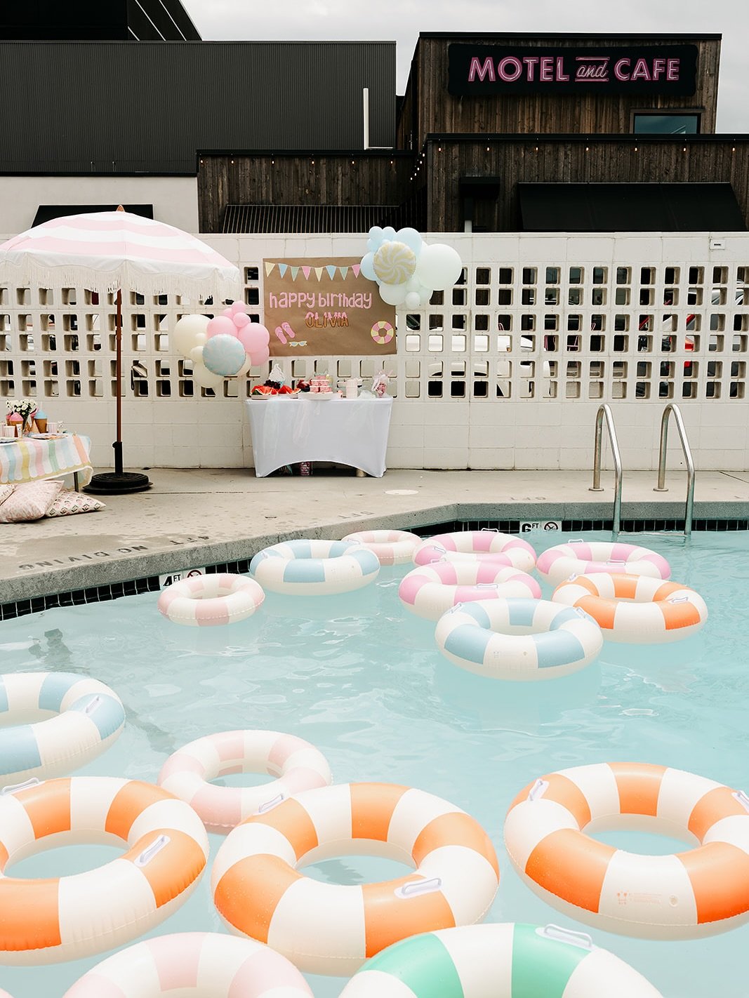 @hillaryfolkvord brings a playful-meets-retro twist to the modern motel party. Pastel-striped floaties float lazily across the pool while soft balloon clouds and a paper-style banner set a crafty, charming tone against the graphic midcentury backdrop.