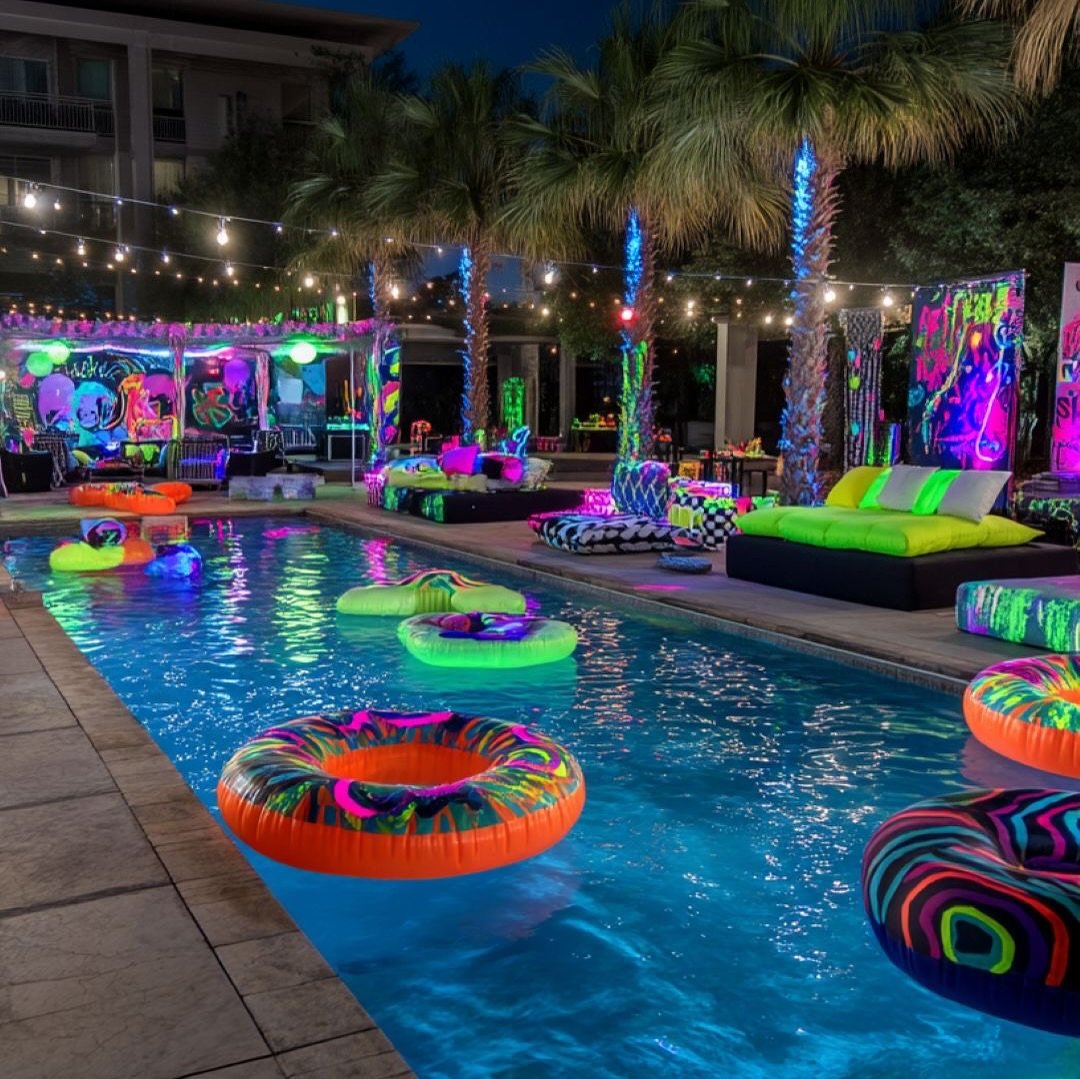 Welcome to the pool party of your electric dreams. @iselhms.cindychaves.realestate goes full neon-glow with this after-dark bash—think blacklights, graffiti art, and LED floaties in highlighter hues. There’s a rebellious edge to it all, softened by cozy lounges and moody palm trees wrapped in lights.