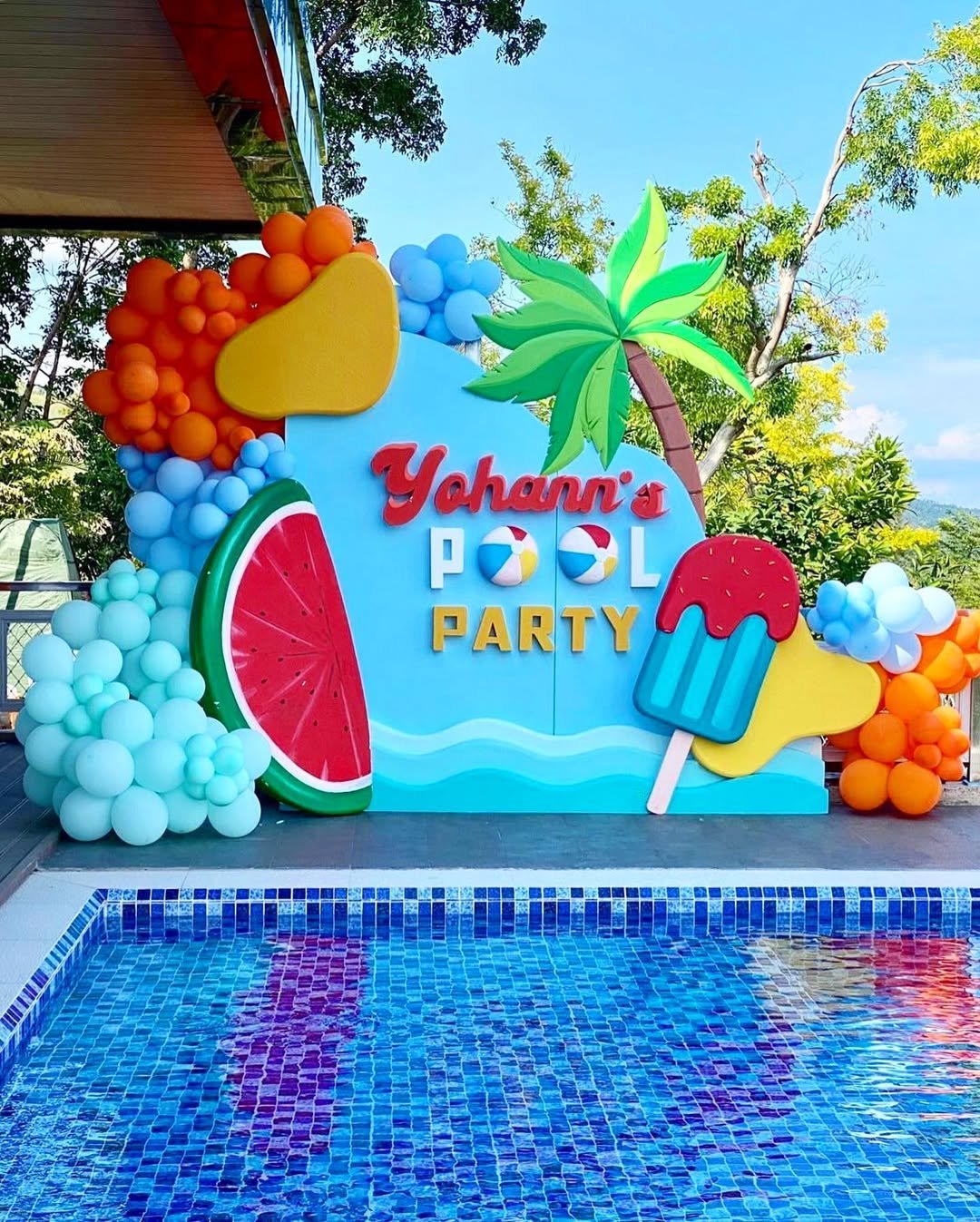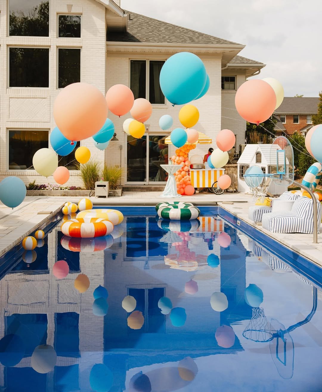 There’s something so nostalgic yet elevated about @chicfromchicago’s pool party setup. Huge floating balloons in sherbet shades of coral, mint, and lemon set the scene for a retro resort vibe, while candy-striped floaties and a citrus-hued umbrella cart bring the playful details.