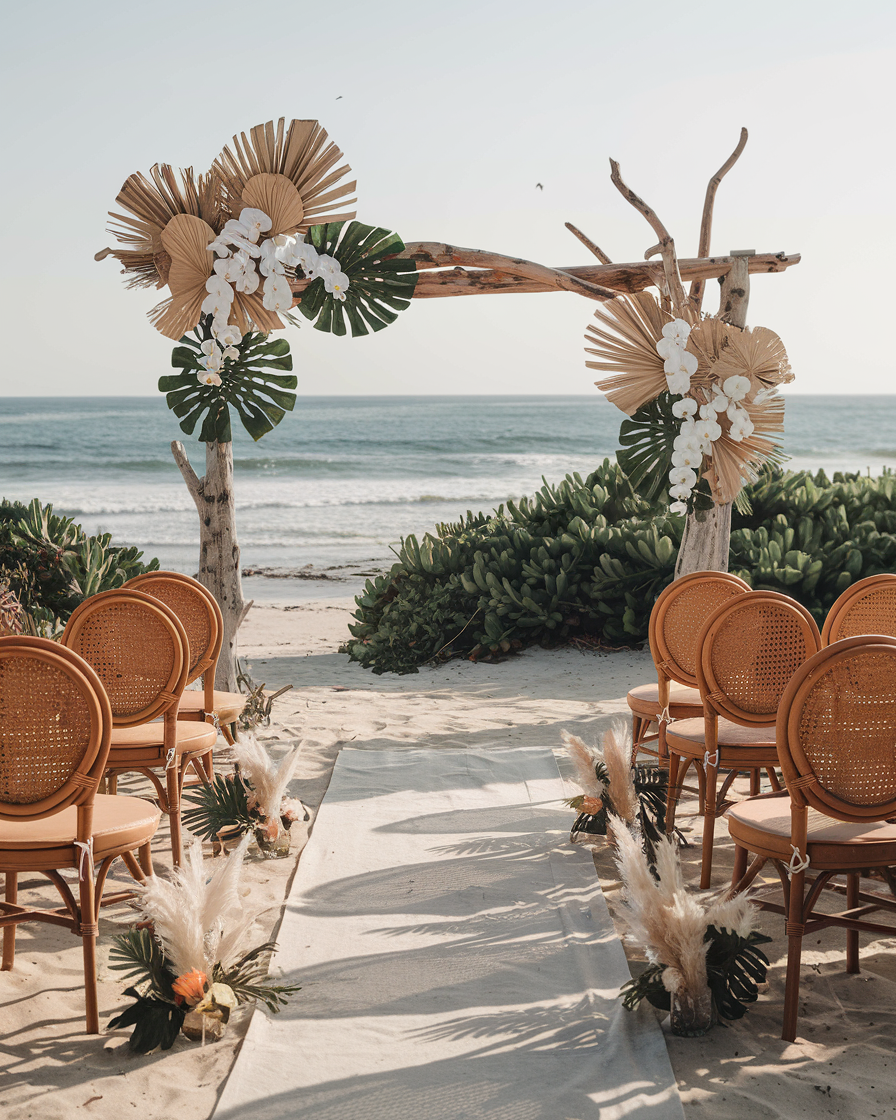 The driftwood arch, the palm fans, those easy, breezy rattan chairs—this setup leans full-on boho without feeling overstyled. I’m obsessed with how the florals are just enough—those wispy pampas tufts and sculptural orchids totally nailed that undone elegance. It’s like the ceremony version of salty hair and sun-kissed skin.