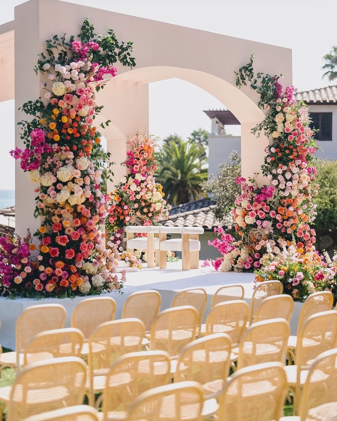 The neutral arch gave major destination-wedding calm, but those florals? A full color crush—pinks, oranges, fuchsia, and a little bougainvillea just to show off. It’s fresh, fun, and unapologetically bold.