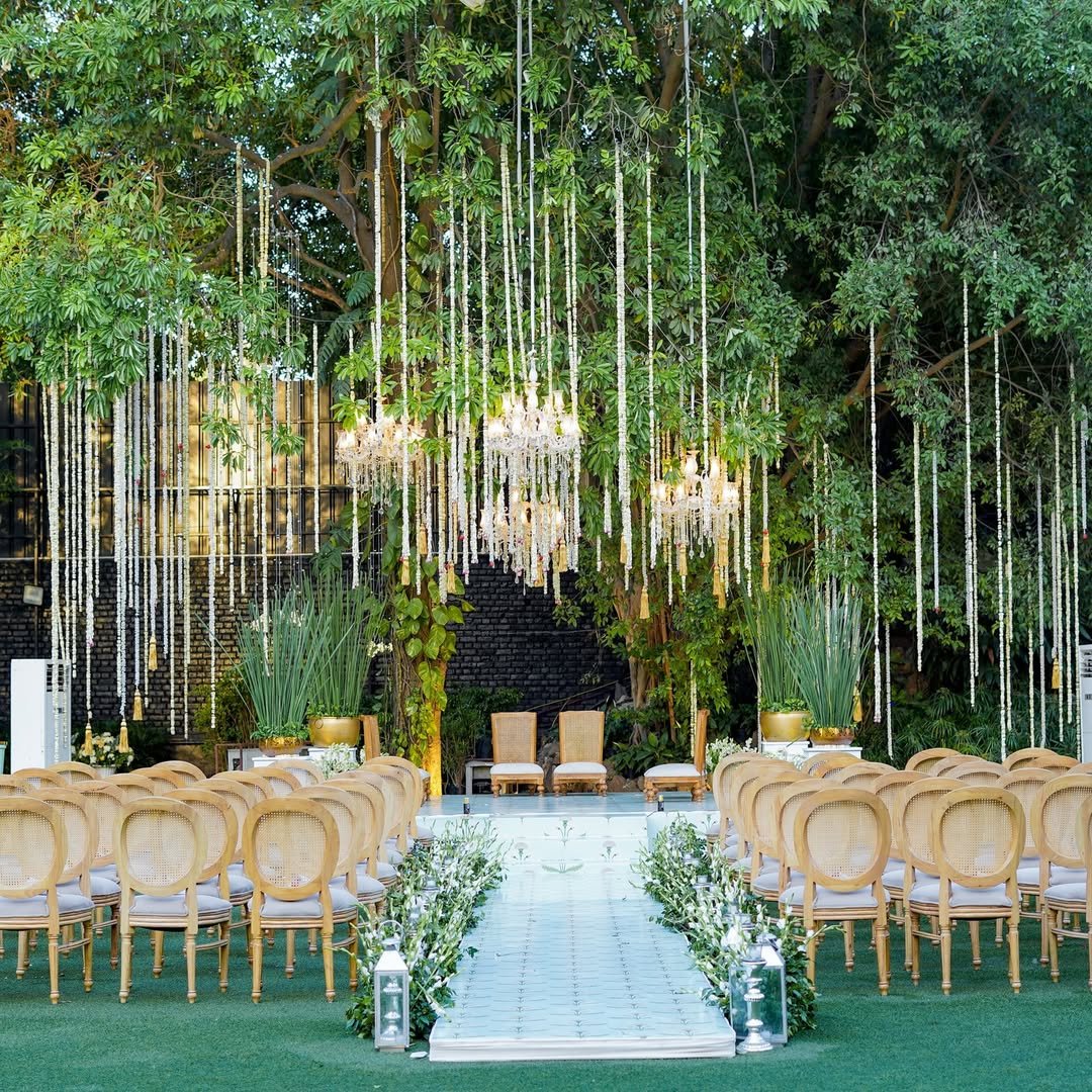 I saw this setup and immediately thought, Yes, this is how summer should feel. Breezy, green, and just extra enough with chandeliers hanging like they grew from the trees.
