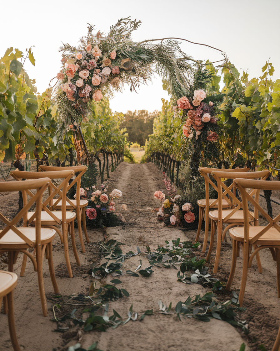 There’s a kind of hush that falls over a vineyard at dusk—just soft dirt, trailing eucalyptus, and that curve of the floral arch like nature’s own exhale. I could smell the grapes just looking at it (and not just because I mentally paired this with a chilled rosé).