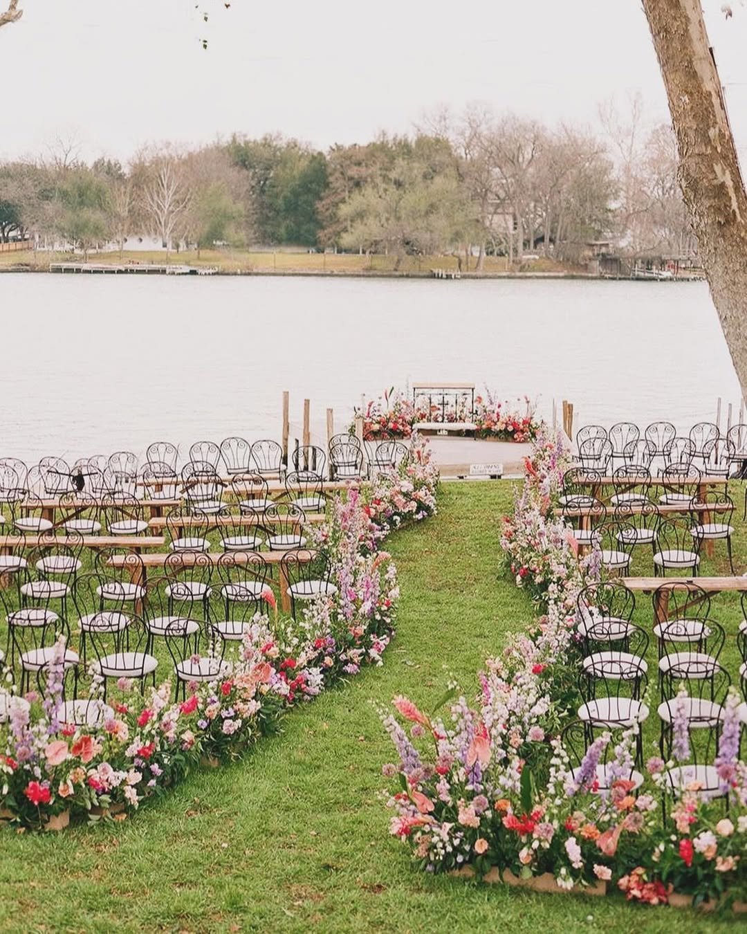 The iron chairs gave it vintage charm, while the aisle—framed by wild, bursting blooms—felt like a meadow moment in the middle of a love story. And that view? Nature’s guest of honor.