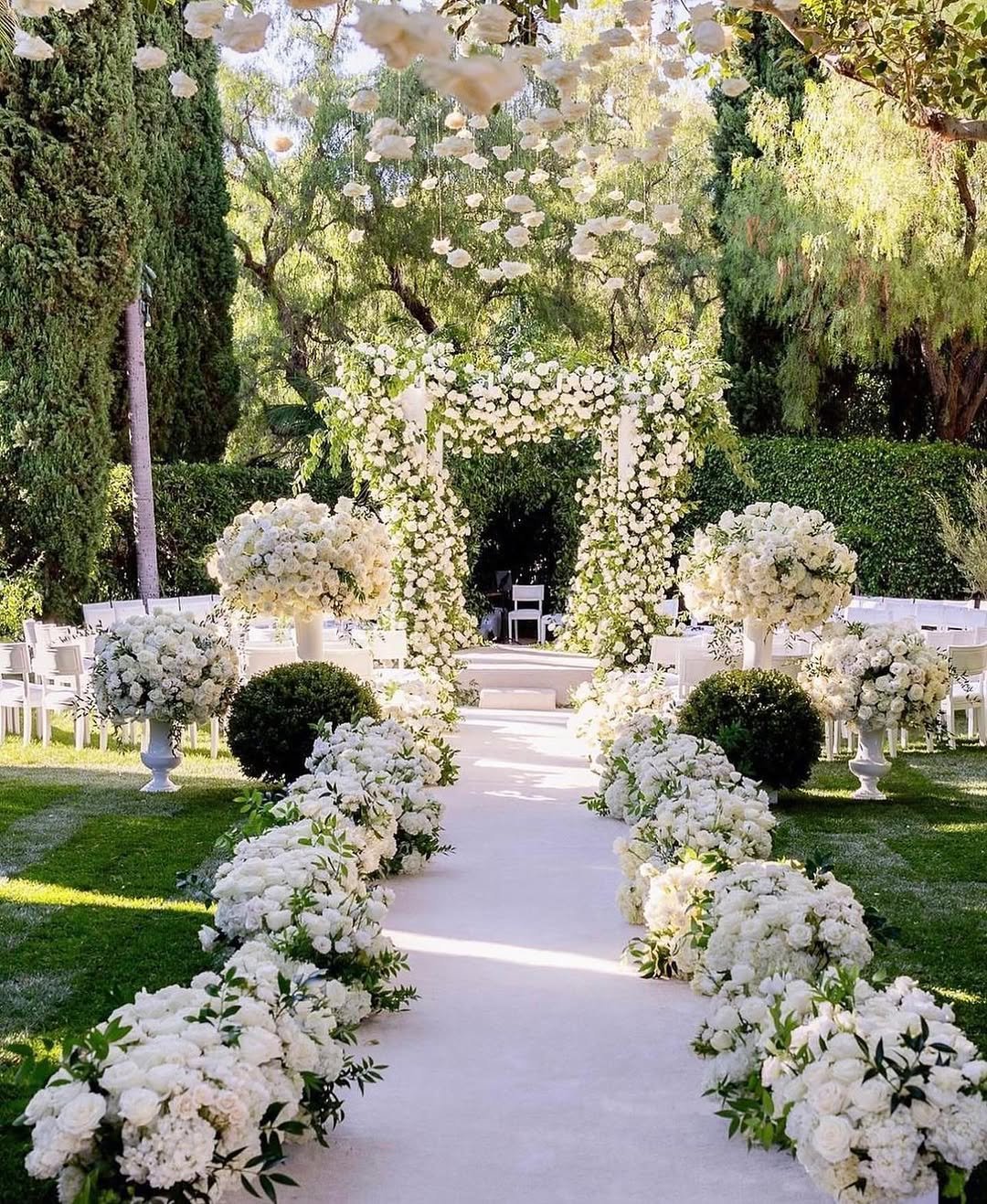 I didn’t think white could be this lush, but here we are—floating down an aisle lined with clouds of roses and perfectly placed greenery.