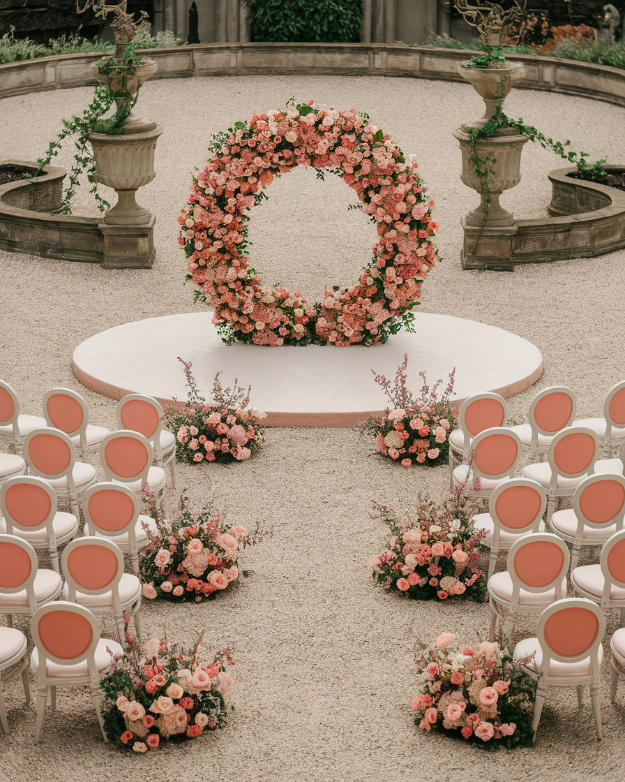 The symmetry? Immaculate. The chairs? Giving Regency chic meets peach sorbet. And those clusters of blooms along the aisle? They didn’t walk—they arrived. Everything about this setup felt like it was curated by someone who drinks champagne with breakfast and believes in the power of a bold backdrop.
