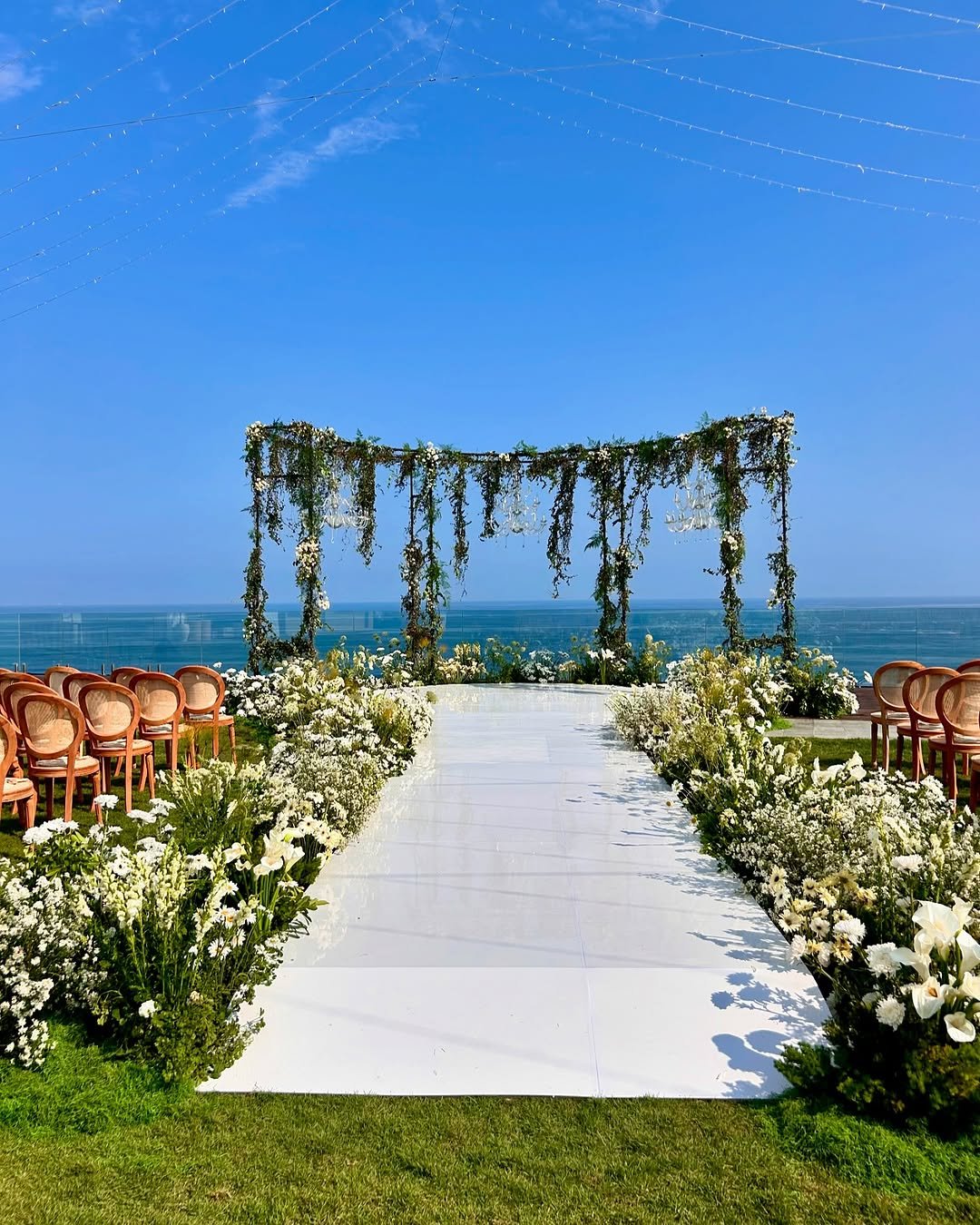 The draped canopy above swayed just enough to make the moment feel alive, while the muted white blooms lining the aisle kept it all grounded and unfussy. And that pergola? A little wild, a little weathered, and totally perfect against the sea.