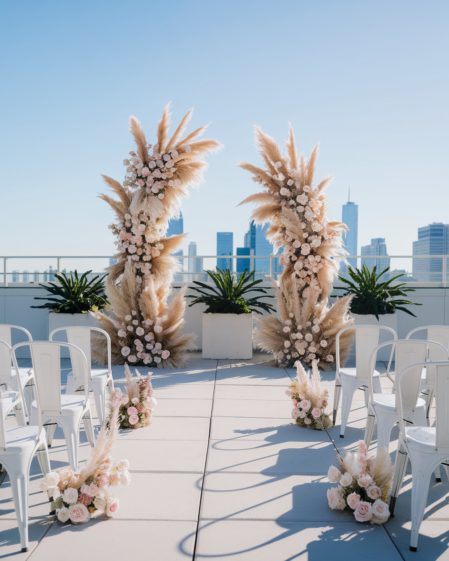 I mean, pampas, meet penthouse. The way those feathery plumes catch the sun? I almost clapped. And those pale blush roses woven through? Chef’s kiss. It’s minimal, but make it dramatic.