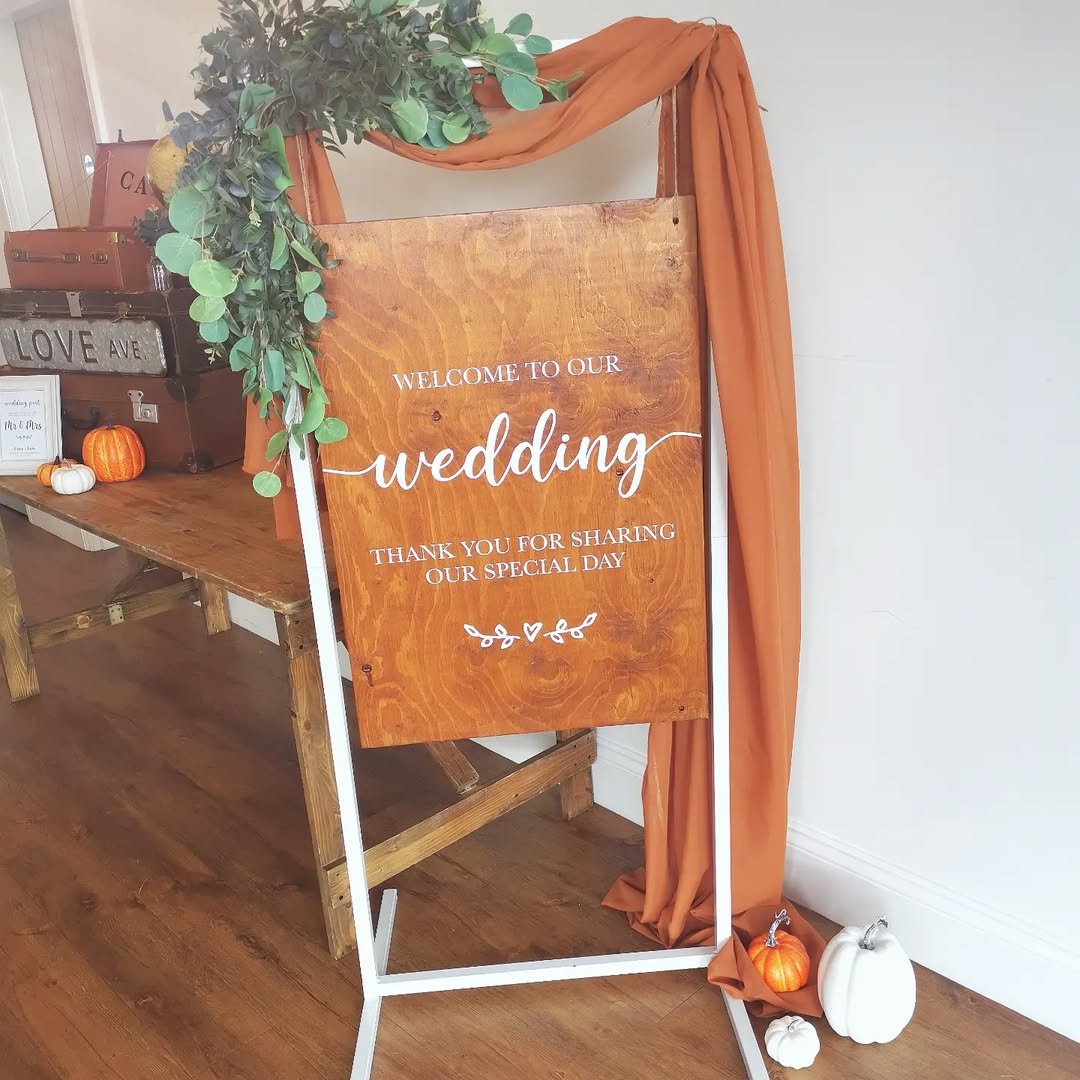 Wood grain, white ink, and autumn textures come together in this sweet sign by @frillyfoxcreativeco. Draped with rust fabric and eucalyptus, it feels like the warm embrace of a fall celebration.