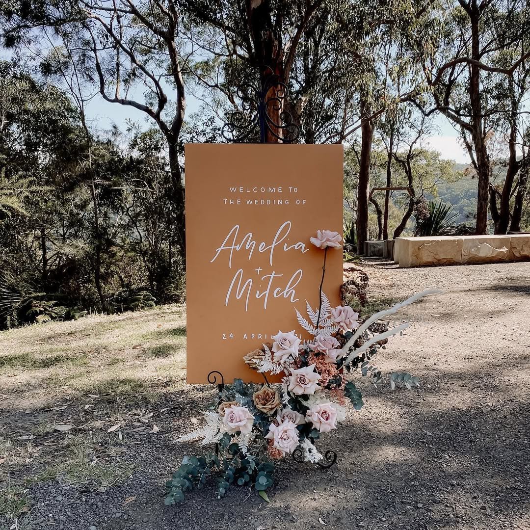 There’s something so captivating about this freestanding terracotta board nestled among native trees. Designed by @bbcollective_, it pairs romantic calligraphy with a sculptural floral base—blush roses, dried ferns, and earthy textures that echo the natural setting.