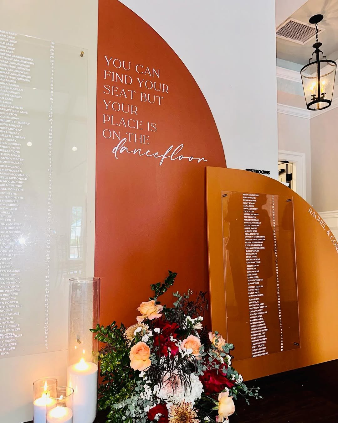 There’s something undeniably magnetic about terracotta tones paired with crisp type and candlelight. This wedding sign setup feels like a chic hotel lobby turned reception lounge—with an edge. That sweeping rust arch draws you in, while the clever phrase (“your place is on the dancefloor”) sets the mood for a celebration that doesn’t take itself too seriously.