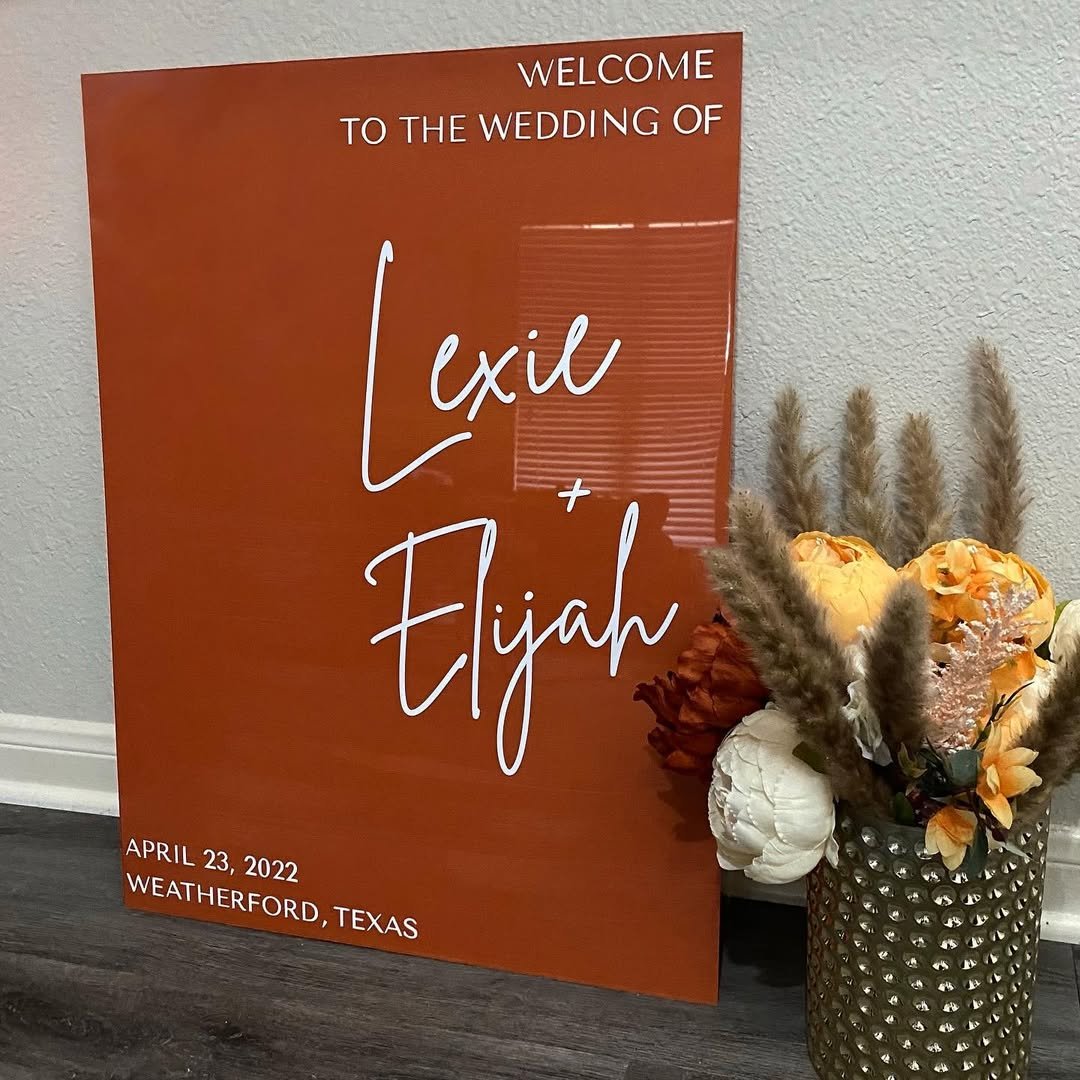 If sleek and modern is your thing, @dfwsigns delivers with this high-gloss rust-toned acrylic sign. Set indoors with a cluster of warm-toned florals and pampas plumes, it strikes a bold chord while still feeling wedding-appropriate.